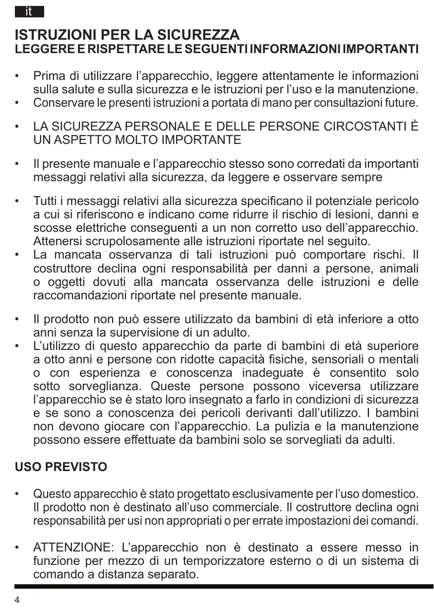 Questo apparecchio è stato progettato esclusivamente per l’uso domestico. Il prodotto non è destinato all’uso commerciale. Il costruttore declina ogni responsabilità per usi non appropriati o per errate impostazioni dei comandi.