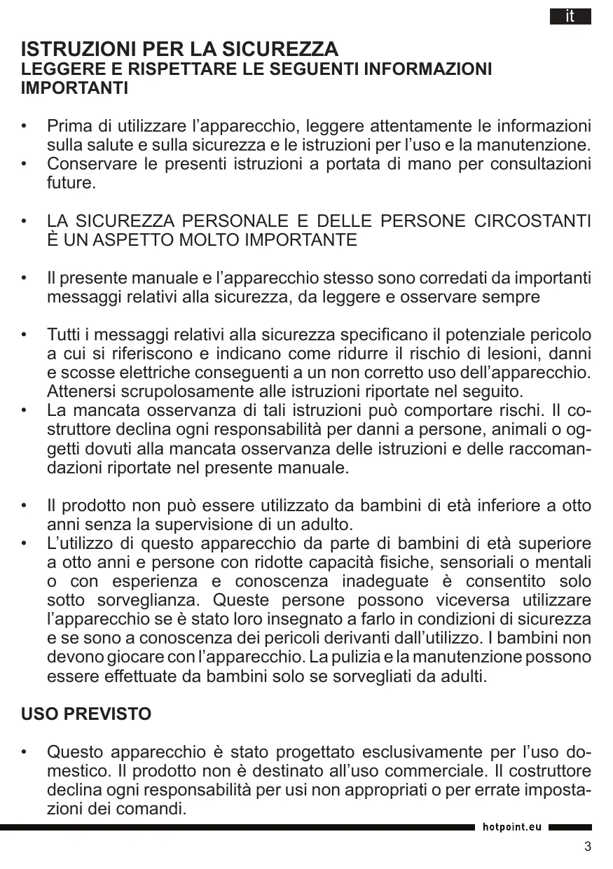 Il prodotto non può essere utilizzato da bambini di età inferiore a otto anni senza la supervisione di un adulto. L’utilizzo di questo apparecchio da parte di bambini di età superiore a otto anni e persone con ridotte capacità fisiche, sensoriali o mentali o con esperienza e conoscenza inadeguate è consentito solo sotto sorveglianza. Queste persone possono viceversa utilizzare l’apparecchio se è stato loro insegnato a farlo in condizioni di sicurezza e se sono a conoscenza dei pericoli derivanti dall’utilizzo. I bambini non devono giocare con l’apparecchio. La pulizia e la manutenzione possono essere effettuate da bambini solo se sorvegliati da adulti. USO PREVISTO
