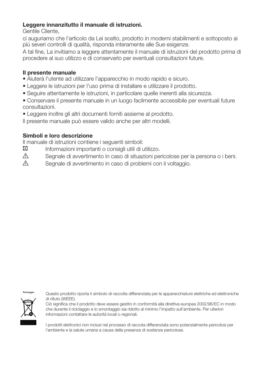 2 Avvertenze importanti per la sicurezza 4 Uso previsto 4 Sicurezza generale 4 Sicurezza bambini 6 Avvertenza HCA 6 Cose da fare per risparmiare energia.. 6