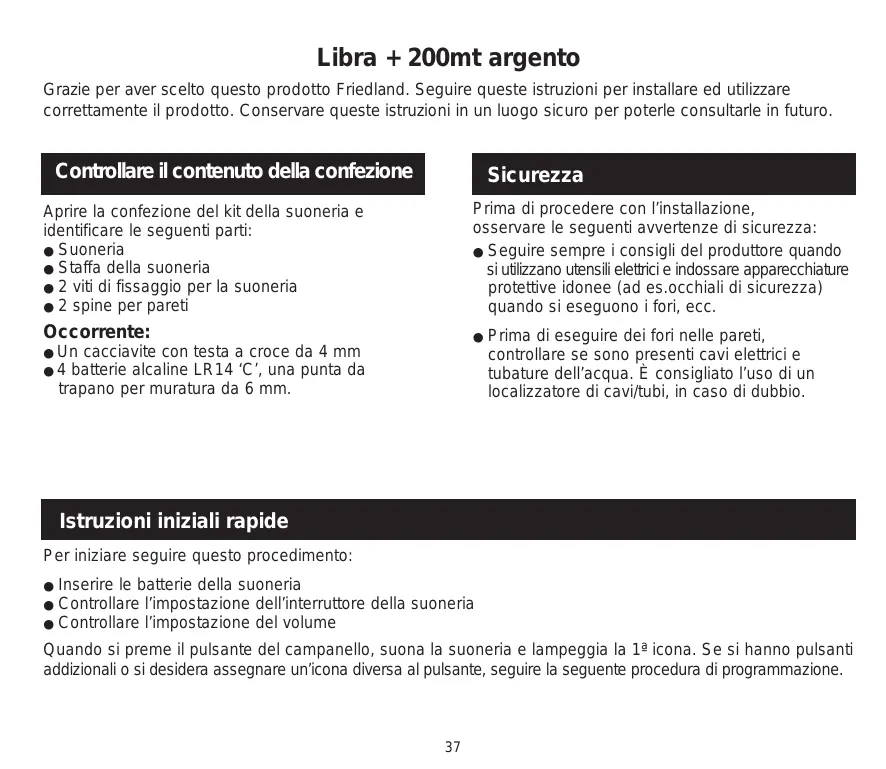ITALY Funzione di richiamo............................................. Pg. 40 Suoni della suoneria ............................................. Montaggio del pulsante del campanello................ Risoluzione dei problemi ...................................... Libra + 200mt argento Grazie per aver scelto questo prodotto Friedland. Seguire queste istruzioni per installare ed utilizzare correttamente il prodotto. Conservare queste istruzioni in un luogo sicuro per poterle consultarle in futuro. Controllare il contenuto della confezione Sicurezza Aprire la confezione del kit della suoneria e identificare le seguenti parti: ● Suoneria ● Staffa della suoneria ● 2 viti di fissaggio per la suoneria ● 2 spine per pareti Prima di procedere con l’installazione, osservare le seguenti avvertenze di sicurezza: ● Seguire sempre i consigli del produttore quando si utilizzano utensili elettrici e indossare apparecchiature protettive idonee (ad es.occhiali di sicurezza) quando si eseguono i fori, ecc. Occorrente: