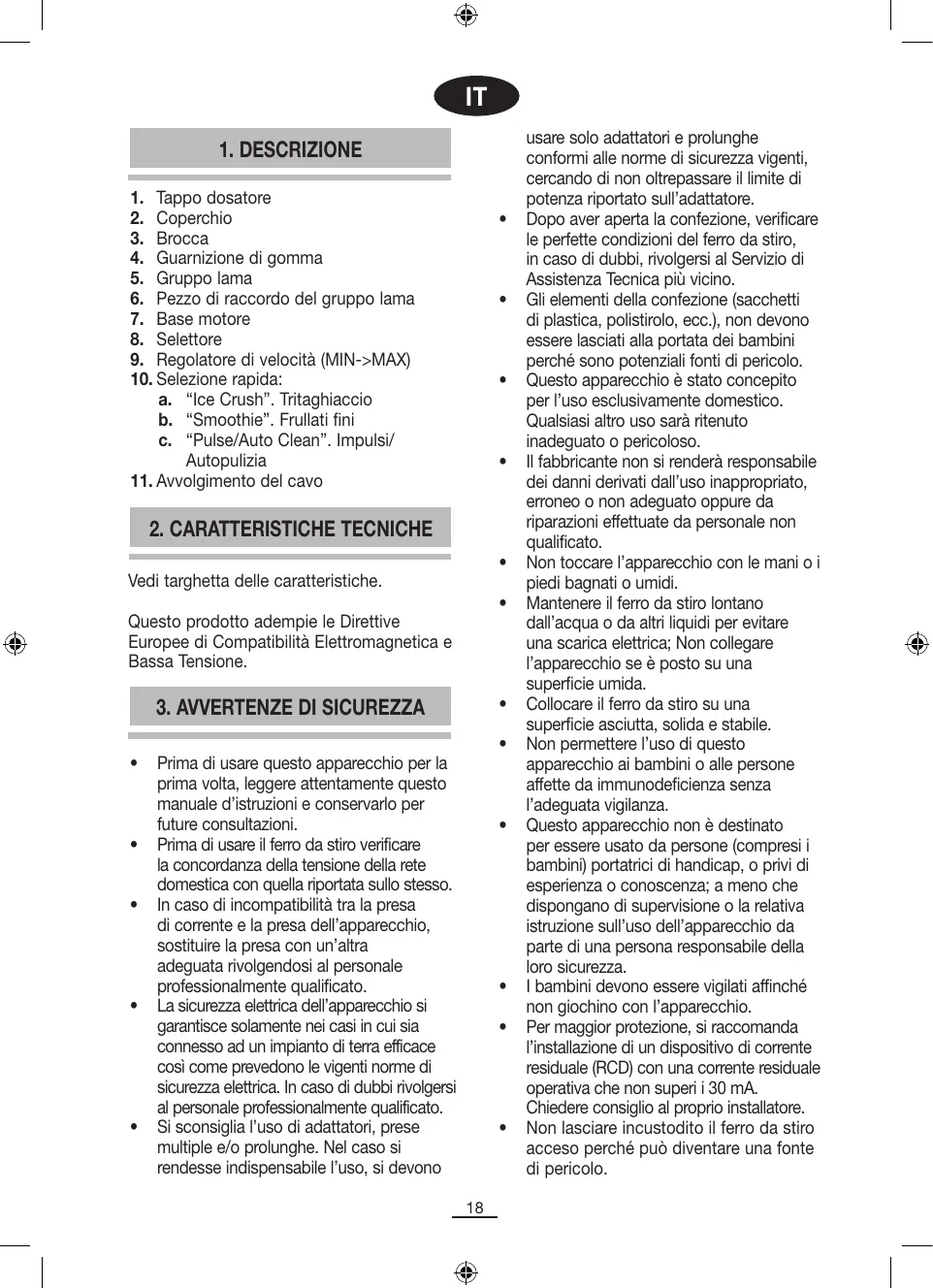 Non tirare mai dal cavo per scollegare l’apparecchio. Scollegare il ferro da stiro prima di effettuare una qualsiasi operazione di pulizia o di manutenzione. In caso di avaria o di guasto dell’apparecchio, spegnerlo e non cercare di sistemarlo. In caso di necessitare una riparazione rivolgersi solo ad un servizio di assistenza tecnica autorizzata dal fabbricante e richiedere l’uso di ricambi originali. L’utilizzatore non deve procedere alla sostituzione del cavo. Nei casi in cui fosse rovinato o danneggiato, rivolgersi esclusivamente ad un Servizio di Assistenza Tecnica autorizzato dal fabbricante. Non lasciare il ferro da stiro esposto agli agenti atmosferici (pioggia, sole, gelo ecc.). Non usare o collocare nessuna parte di questo ferro da stiro sopra o vicino a superfici calde (fornelli a gas, elettrici o forni). Non utilizzare detersivi o panni abrasivi per pulire l’apparecchio. Non toccare le superfici calde. Utilizzare i manici. Evitare che il cavo entri in contatto con le parti calde dell’apparecchio. La lama è molto affilata: maneggiarla con cura per evitare di tagliarsi. Non riempire il frullatore oltre il livello massimo. Non togliere la brocca dalla base motore quando l’apparecchio è in funzione. Usare sempre il frullatore con il coperchio della brocca ben collocato. Non infilare la mano o altri oggetti nella brocca quando l’apparecchio è in funzione. Se necessario, scollegare l’apparecchio e usare una spatola per rimuovere gli alimenti rimasti attaccati alle pareti della brocca. Non immergere la base motore in acqua né altri liquidi. Non toccare i pezzi girevoli mentre sono in movimento; attendere che si fermino. Non usare questo prodotto per scopi diversi dalla preparazione degli alimenti.