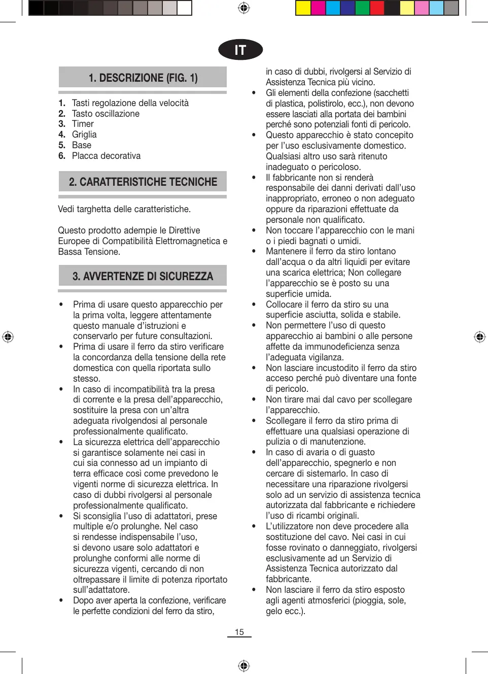 Prima di usare questo apparecchio per la prima volta, leggere attentamente questo manuale d’istruzioni e conservarlo per future consultazioni. Prima di usare il ferro da stiro verificare la concordanza della tensione della rete domestica con quella riportata sullo stesso. In caso di incompatibilità tra la presa di corrente e la presa dell’apparecchio, sostituire la presa con un’altra adeguata rivolgendosi al personale professionalmente qualificato. La sicurezza elettrica dell’apparecchio si garantisce solamente nei casi in cui sia connesso ad un impianto di terra efficace così come prevedono le vigenti norme di sicurezza elettrica. In caso di dubbi rivolgersi al personale professionalmente qualificato. Si sconsiglia l’uso di adattatori, prese multiple e/o prolunghe. Nel caso si rendesse indispensabile l’uso, si devono usare solo adattatori e prolunghe conformi alle norme di sicurezza vigenti, cercando di non oltrepassare il limite di potenza riportato sull’adattatore. Dopo aver aperta la confezione, verificare le perfette condizioni del ferro da stiro,