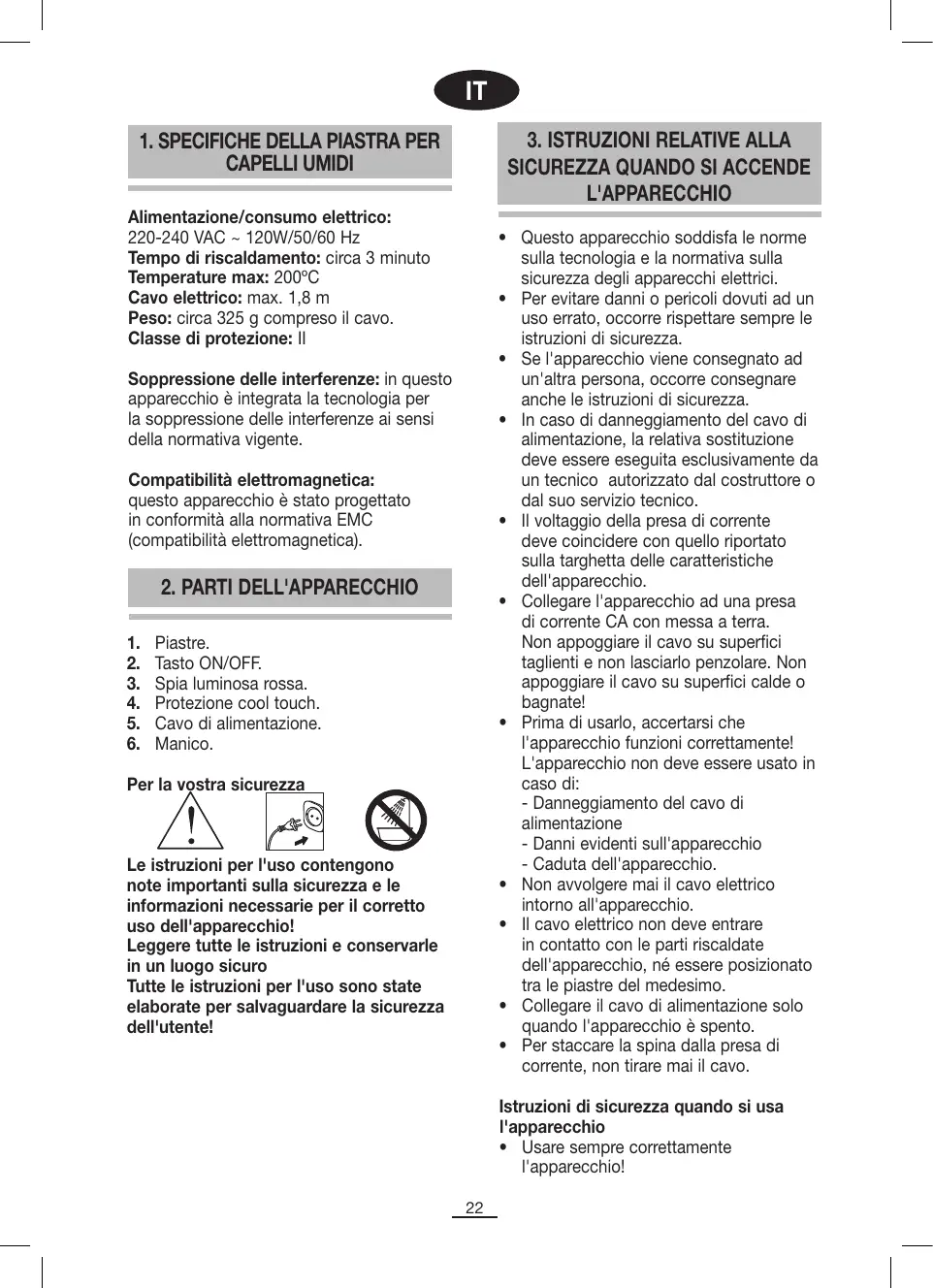 CAPELLI UMIDI Alimentazione/consumo elettrico: 220-240 VAC ~ 120W/50/60 Hz Tempo di riscaldamento: circa 3 minuto Temperature max: 200ºC Cavo elettrico: max. 1,8 m Peso: circa 325 g compreso il cavo. Classe di protezione: II