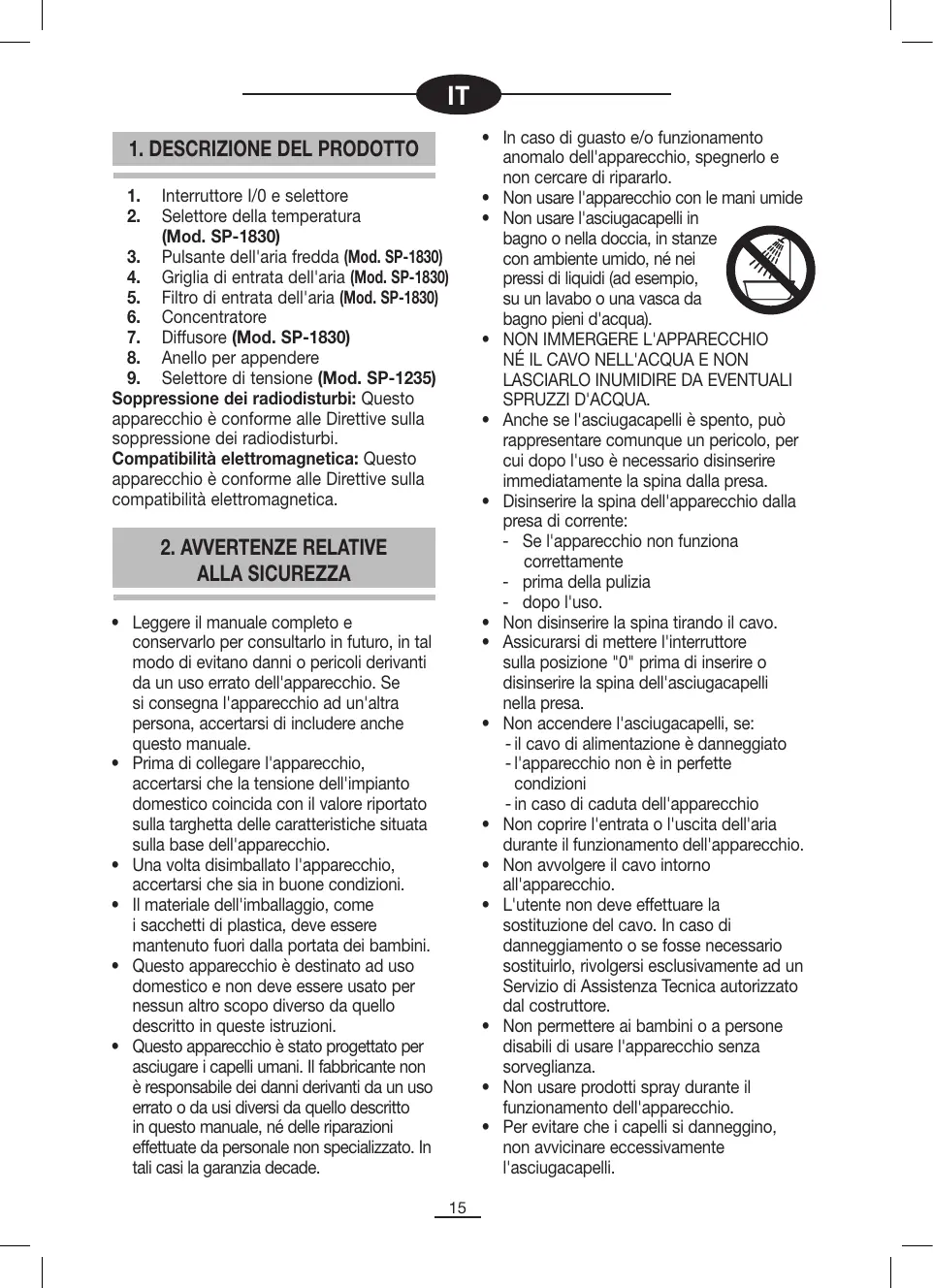 - NON IMMERGERE L'APPARECCHIONÉ IL CAVO NELL'ACQUA E NONLASCIARLO INUMIDIRE DA EVENTUALISPRUZZI D'ACQUA.