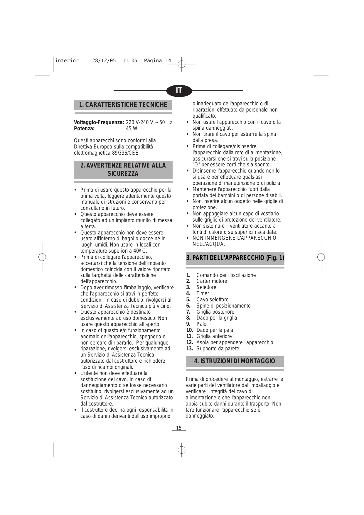 SICUREZZA + Prima di usare questo apparecchio per la prima volta, leggere attentamente questo manuale di istruzioni e conservarlo per consultarlo in futuro + Questo apparecchio deve essere collegato ad un impianto munito di messa a terra + Questo apparecchio non deve essere usato all'interno di bagni o docce né in luoghi umidi. Non usare in locali con temperature superiori a 402 C. Prima di collegare l'apparecchio, accertarsi che la tensione dell'impianto domestico coincida con il valore riportato sulla targhetta delle caratteristiche dell'apparecchio. + Dopo aver rimosso l'imballaggio, verificare che l'apparecchio si trovi in perfette condizioni. In caso di dubbio, rivolgersi al Servizio di Assistenza Tecnica più vicino. + Questo apparecchio à destinato esclusivamente ad uso domestico. Non usare questo apparecchio all'aperto. +_In caso di guasto e/o funzionamento anomalo dell'apparecchio, spegnerlo e non cercare di ripararlo. Per qualunque riparazione, rivolgersi esclusivamente ad un Servizio di Assistenza Tecnica autorizzato dal costruttore e richiedere l'uso di ricambi original L'utente non deve effettuare la sostituzione del cavo. In caso di danneggiamento o se fosse necessario sostituirlo, rivolgersi esclusivamente ad un Servizio di Assistenza Tecnico autorizzato dal costruttore. +_ Il costruttore declina ogni responsabilità in caso di danni derivanti dall'uso improprio 0 inadeguato dell'apparecchio o di riparazioni effettuate da personale non qualificato. Non usare l'apparecchio con il cavo o la spina danneggiati. Non tirare il cavo per estrarre la spina dalla presa. Prima di collegare/disinserire l'apparecchio dalla rete di alimentazione, assicurarsi che si trovi sulla posizione "O" per essere certi che sia spento. Disinserire l'apparecchio quando non lo si usa e per effettuare qualsiasi operazione di manutenzione o di pulizia. Mantenere l'apparecchio fuori dalla portata dei bambini o di persone disabili + Noninserire alcun oggetto nelle griglie di protezione. + Non appoggiare alcun capo di vestiario sulle griglie di protezione del ventilatore. + Non sistemare il ventilatore accanto a fonti di calore o su superfici riscaldate.