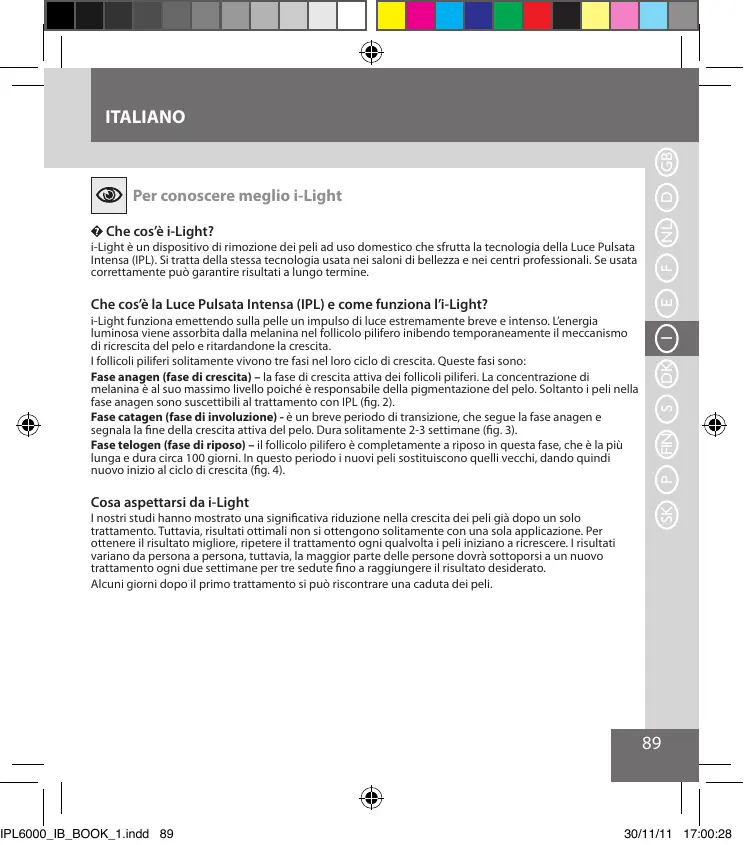 A. No, non è pericoloso per gli occhi a meno che la luce non venga direzonata versus il viso. i-Light è dotato di una systema di sicurezza che precede il lampeggiamont accidentale quando il dispositivo non è a fatto con la pelle. La piccola quantità di luce emessa durante il trattamento è simile a quella del flash di una macchina fotografia e non è danniosa per gli occhi, a meno che non si dia direzonata versus il viso.