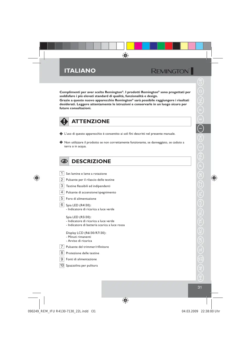 Scarica le istruzioni per il tuo Indefinito in formato PDF gratuitamente! Trova il tuo manuale R7130 - REMINGTON e riprendi in mano il tuo dispositivo elettronico. In questa pagina sono pubblicati tutti i documenti necessari per l'utilizzo del tuo dispositivo. R7130 del marchio REMINGTON.
