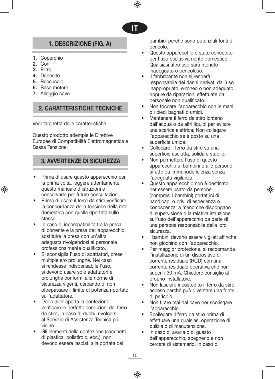 bambini perché sono potenziali fonti di pericolo. Questo apparecchio è stato concepito per l’uso esclusivamente domestico. Qualsiasi altro uso sarà ritenuto inadeguato o pericoloso. Il fabbricante non si renderà responsabile dei danni derivati dall’uso inappropriato, erroneo o non adeguato oppure da riparazioni effettuate da personale non qualificato. Non toccare l’apparecchio con le mani o i piedi bagnati o umidi. Mantenere il ferro da stiro lontano dall’acqua o da altri liquidi per evitare una scarica elettrica; Non collegare l’apparecchio se è posto su una superficie umida. Collocare il ferro da stiro su una superficie asciutta, solida e stabile. Non permettere l’uso di questo apparecchio ai bambini o alle persone affette da immunodeficienza senza l’adeguata vigilanza. Questo apparecchio non è destinato per essere usato da persone (compresi i bambini) portatrici di handicap, o privi di esperienza o conoscenza; a meno che dispongano di supervisione o la relativa istruzione sull’uso dell’apparecchio da parte di una persona responsabile della loro sicurezza. I bambini devono essere vigilati affinché non giochino con l’apparecchio. Per maggior protezione, si raccomanda l’installazione di un dispositivo di corrente residuale (RCD) con una corrente residuale operativa che non superi i 30 mA. Chiedere consiglio al proprio installatore. Non lasciare incustodito il ferro da stiro acceso perché può diventare una fonte di pericolo. Non tirare mai dal cavo per scollegare l’apparecchio. Scollegare il ferro da stiro prima di effettuare una qualsiasi operazione di pulizia o di manutenzione. In caso di avaria o di guasto dell’apparecchio, spegnerlo e non cercare di sistemarlo. In caso di