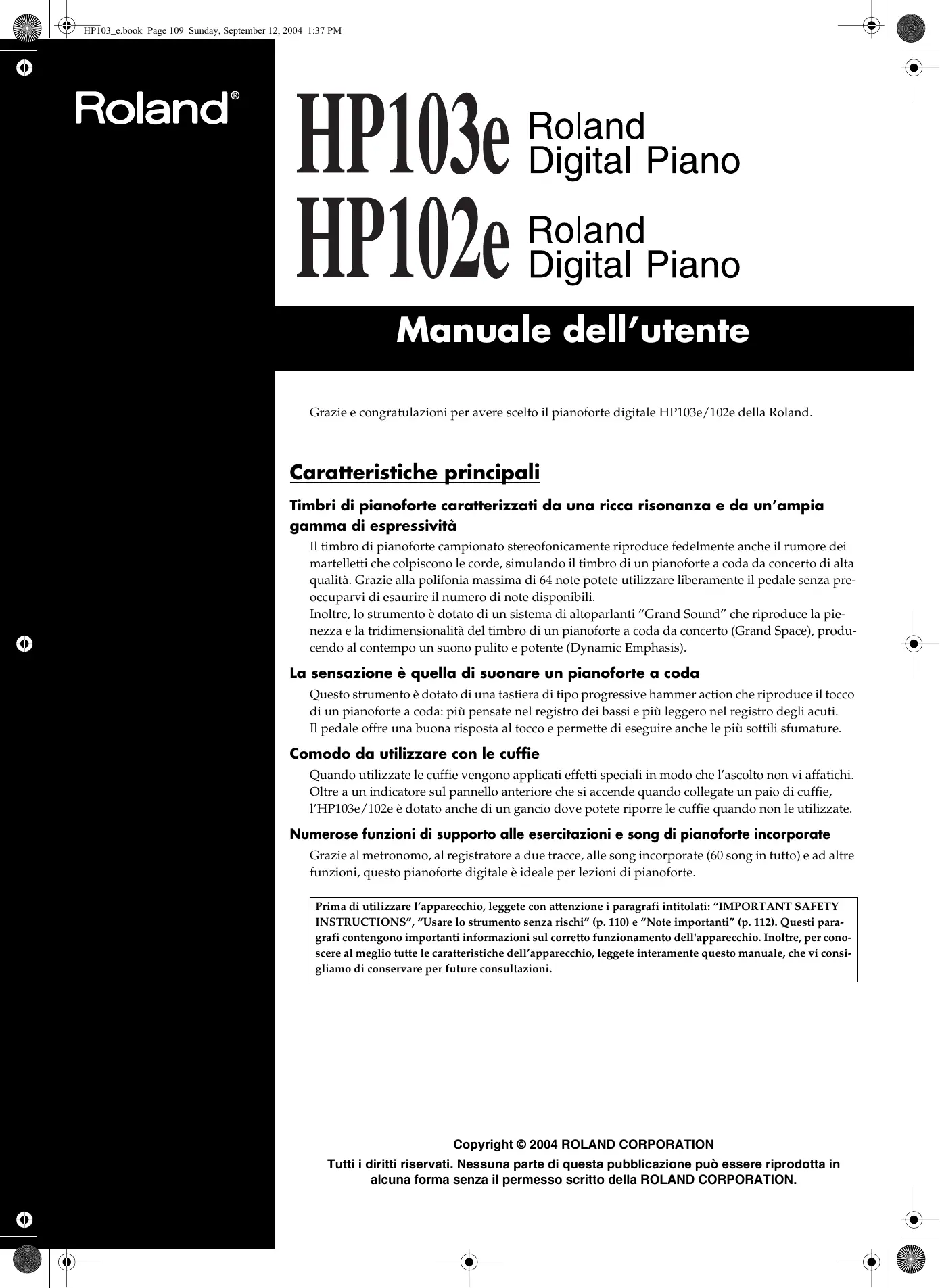 Scarica le istruzioni per il tuo Pianoforte digitale in formato PDF gratuitamente! Trova il tuo manuale HP103E - ROLAND e riprendi in mano il tuo dispositivo elettronico. In questa pagina sono pubblicati tutti i documenti necessari per l'utilizzo del tuo dispositivo. HP103E del marchio ROLAND.