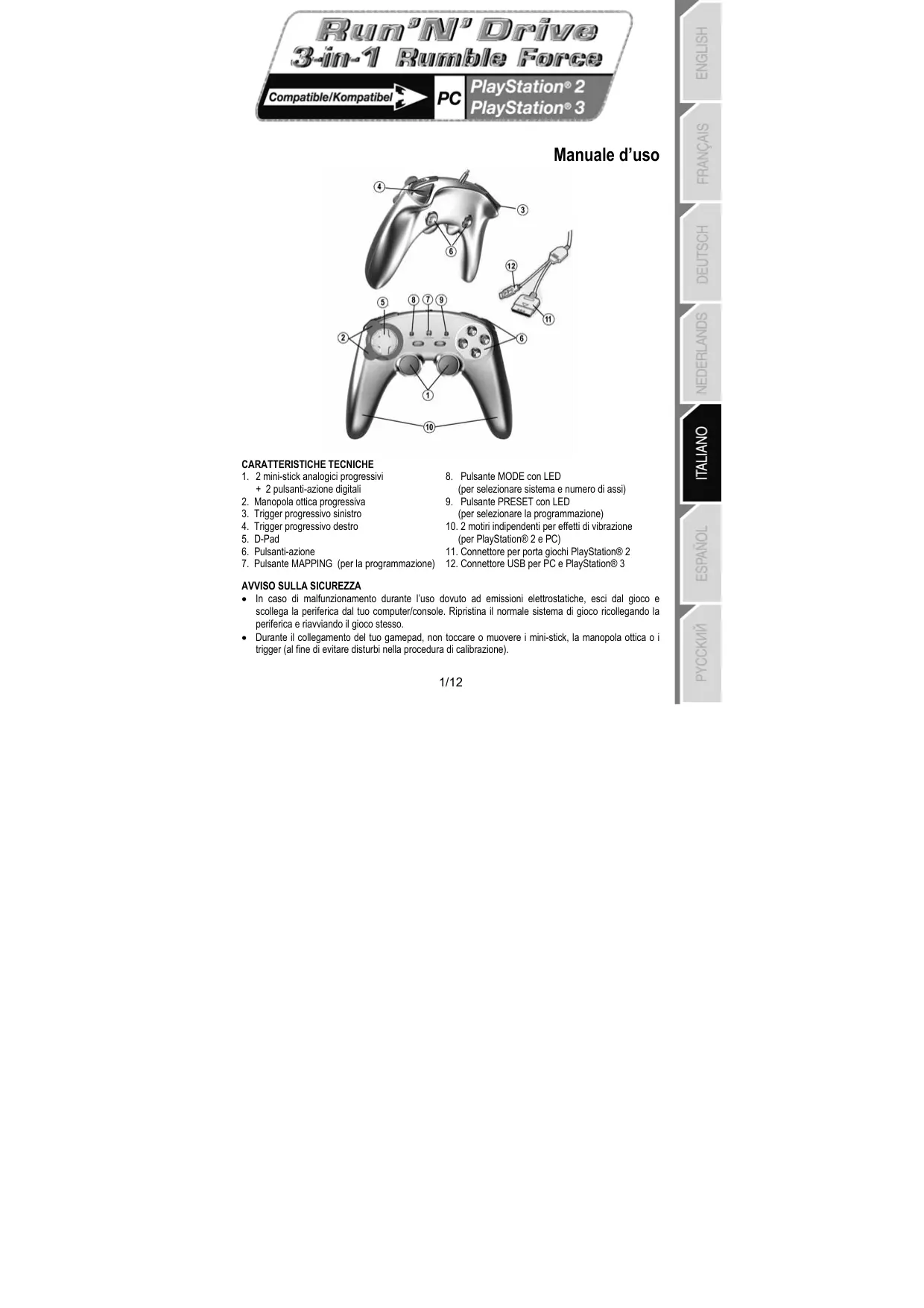 PLAYSTATION® 3 INSTALLAZIONE SU PLAYSTATION® 3 1. Collega il connettore USB (12) ad una porta USB della tua console. 2. Accendi la tua console. 3. Attiva la modalità “PS3” del tuo gamepad = il pulsante MODE dovrebbe risultare spento. (se necessario, per far questo tieni premuto il pulsante MODE finché non si spegnerà). 4. Avvia il gioco. Sei pronto per giocare! MODALITA’ “PLAYSTATION® 3” CONFIGURAZIONE “PROFILO AUTOMATICO” - PLAYSTATION® 3 Modalità “PS3” Il pulsante MODE è SPENTO In questa configurazione: • “Manopola ottica” associata alle direzioni “Sinistra/Destra” del ministick di sinistra • Trigger “Destro” associato alla direzione “Su” del mini-stick destro • Trigger “Sinistro” associato alla direzione “Giù” del mini-stick destro Avvisi importanti per “PlayStation® 3”: - Per “PlayStation® 3”, il pulsante MODE deve essere assolutamente “SPENTO” (non deve essere né rosso, né verde). Se necessario, per far questo premi il pulsante in questione. - Il gamepad “Run’N’ Drive” non è dotato del “motion sensor” e del pulsante “PS”, contrariamente al gamepad ufficiale che trovi all’interno della confezione della tua console. - In modalità “1 Giocatore”: se il tuo gamepad ufficiale è acceso, dovrai spostarlo sulla “controller port 2” affinchè il tuo gamepad “Run’N’ Drive” funzioni correttamente. - Per “PlayStation® 3”, il gamepad “Run’N’ Drive” è compatibile unicamente con i giochi realizzati per “PlayStation® 3” (non funzionerà con i titoli per “PlayStation® 2”). - Per uscire dai giochi per “PlayStation® 3”, usa il pulsante “PS” del tuo gamepad ufficiale.