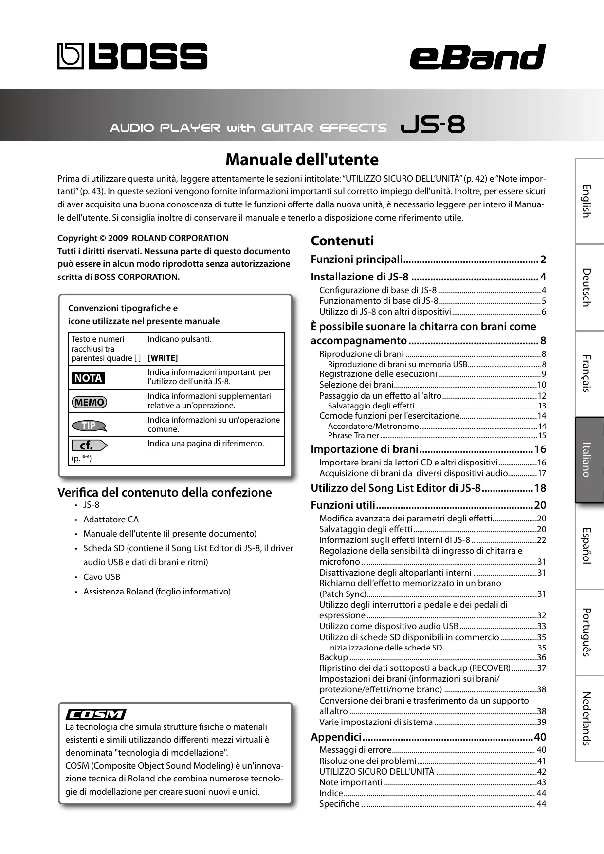 - Manuale dell'utente (il presente documento) Configurazione di base di JS-8......................................................4 Funzionamento di base di JS-8.....................................................5 Utilizzo di JS-8 con altri dispositivi...............................................6 Italiano TIP Funzioni principali................................................... 2 Installazione di JS-8................................................ 4 Français Indicano pulsanti. Testo e numeri racchiusi tra parentesi quadre [ ] [WRITE] Contenuti Deutsch Copyright © 2009 ROLAND CORPORATION Tutti i diritti riservati. Nessuna parte di questo documento può essere in alcun modo riprodotta senza autorizzazione scritta di BOSS CORPORATION. English Prima di utilizzare questa unità, leggere attentamente le sezioni intitolate: “UTILIZZO SICURO DELL’UNITÀ” (p. 42) e “Note importanti” (p. 43). In queste sezioni vengono fornite informazioni importanti sul corretto impiego dell'unità. Inoltre, per essere sicuri di aver acquisito una buona conoscenza di tutte le funzioni offerte dalla nuova unità, è necessario leggere per intero il Manuale dell'utente. Si consiglia inoltre di conservare il manuale e tenerlo a disposizione come riferimento utile.