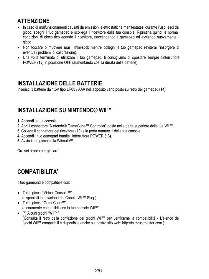 COMPATIBILITA’ Il tuo gamepad è compatibile con: • Tutti i giochi “Virtual Console™” (disponibili in download dal Canale Wii™ Shop) • Tutti i giochi “GameCube™” (pienamente compatibili con la tua console Wii™) • (*) Alcuni giochi “Wii™” (Consulta il retro della confezione dei giochi Wii™ per verificarne la compatibilità - L'elenco dei giochi Wii™ compatibili è disponibile anche sul nostro sito web: http://ts.thrustmaster.com.)