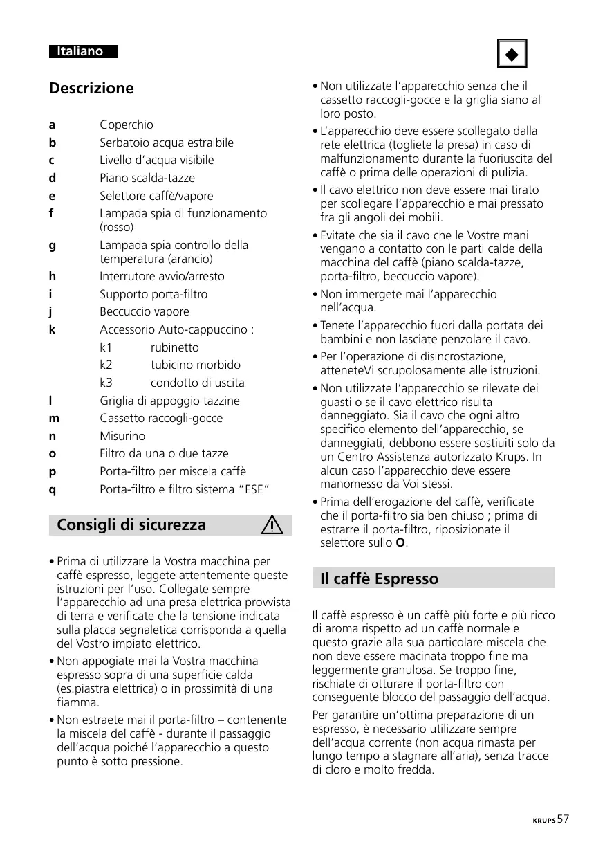 Coperchio Serbatoio acqua estraibile Livello d’acqua visibile Piano scalda-tazze Selettore caffè/vapore Lampada spia di funzionamento (rosso) Lampada spia controllo della temperatura (arancio) Interrutore avvio/arresto Supporto porta-filtro Beccuccio vapore Accessorio Auto-cappuccino : rubinetto tubicino morbido condotto di uscita Griglia di appoggio tazzine Cassetto raccogli-gocce Misurino Filtro da una o due tazze Porta-filtro per miscela caffè Porta-filtro e filtro sistema “ESE” Consigli di sicurezza