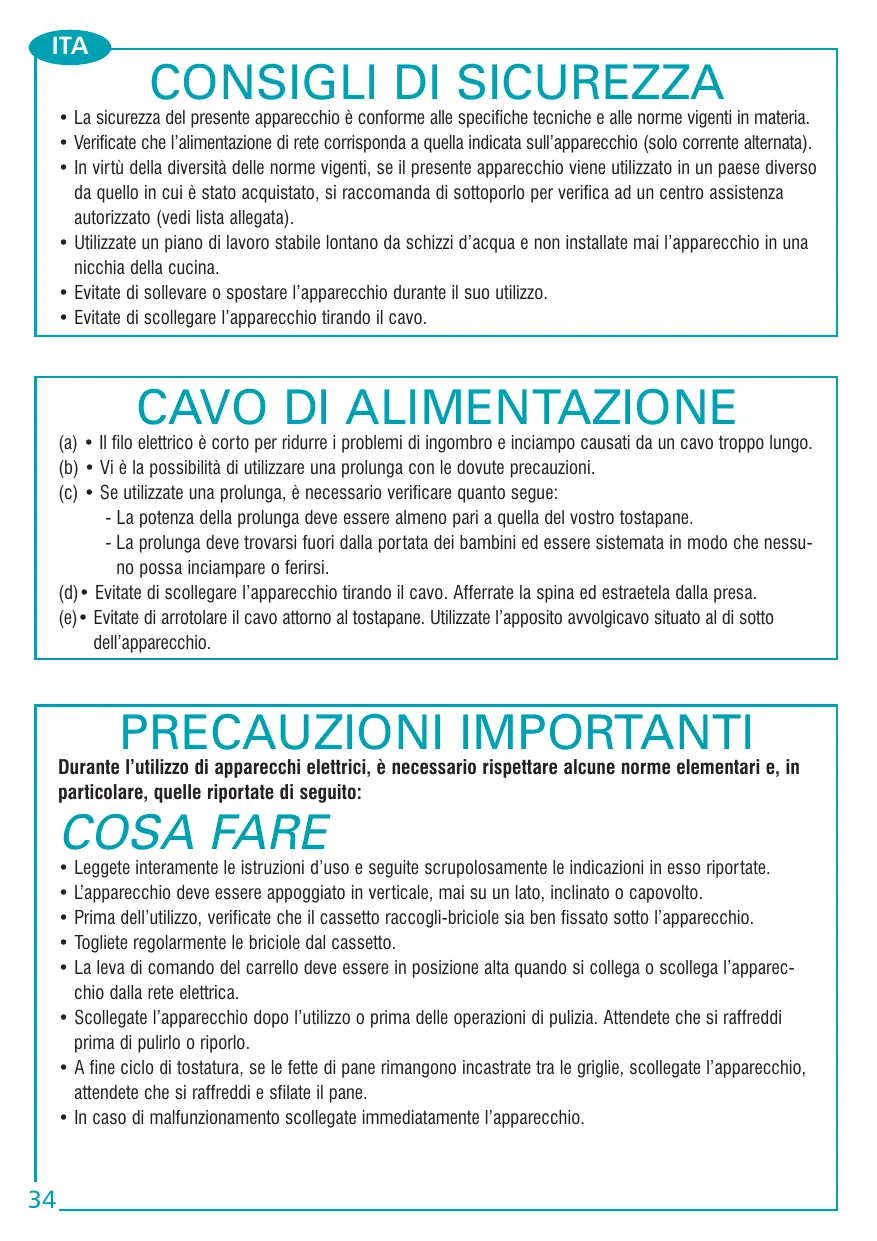 (a) • Il filo elettrico è corto per ridurre i problemi di ingombro e inciampo causati da un cavo troppo lungo. (b) • Vi è la possibilità di utilizzare una prolunga con le dovute precauzioni. (c) • Se utilizzate una prolunga, è necessario verificare quanto segue: - La potenza della prolunga deve essere almeno pari a quella del vostro tostapane. - La prolunga deve trovarsi fuori dalla portata dei bambini ed essere sistemata in modo che nessuno possa inciampare o ferirsi. (d)• Evitate di scollegare l’apparecchio tirando il cavo. Afferrate la spina ed estraetela dalla presa. (e)• Evitate di arrotolare il cavo attorno al tostapane. Utilizzate l’apposito avvolgicavo situato al di sotto dell’apparecchio. PRECAUZIONI IMPORTANTI Durante l’utilizzo di apparecchi elettrici, è necessario rispettare alcune norme elementari e, in particolare, quelle riportate di seguito: COSA FARE