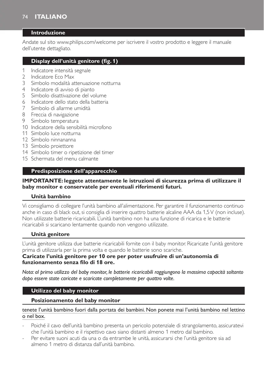 Italiano Introduzione Andate sul sito www.philips.com/welcome per iscrivere il vostro prodotto e leggere il manuale dell’utente dettagliato. Display dell’unità genitore (fig. 1)