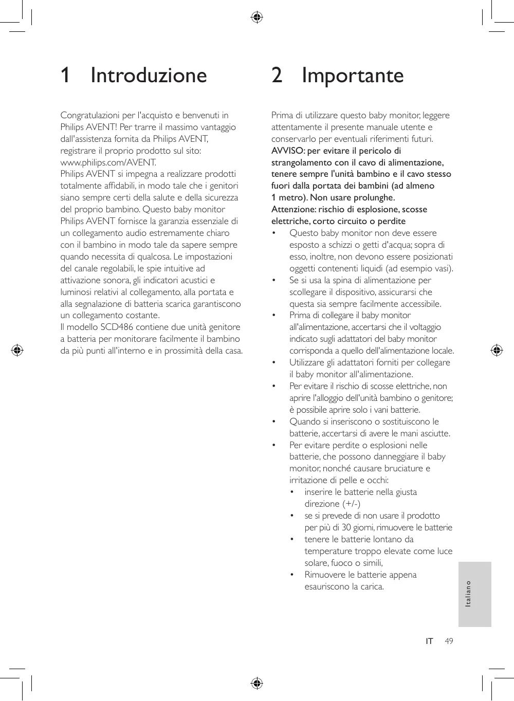 2 Importante Congratulazioni per l'acquisto e benvenuti in Philips AVENT! Per trarre il massimo vantaggio dall'assistenza fornita da Philips AVENT, registrare il proprio prodotto sul sito: www.philips.com/AVENT. Philips AVENT si impegna a realizzare prodotti totalmente affidabili, in modo tale che i genitori siano sempre certi della salute e della sicurezza del proprio bambino. Questo baby monitor Philips AVENT fornisce la garanzia essenziale di un collegamento audio estremamente chiaro con il bambino in modo tale da sapere sempre quando necessita di qualcosa. Le impostazioni del canale regolabili, le spie intuitive ad attivazione sonora, gli indicatori acustici e luminosi relativi al collegamento, alla portata e alla segnalazione di batteria scarica garantiscono un collegamento costante. Il modello SCD486 contiene due unità genitore a batteria per monitorare facilmente il bambino da più punti all'interno e in prossimità della casa. Prima di utilizzare questo baby monitor, leggere attentamente il presente manuale utente e conservarlo per eventuali riferimenti futuri. AVVISO: per evitare il pericolo di strangolamento con il cavo di alimentazione, tenere sempre l'unità bambino e il cavo stesso fuori dalla portata dei bambini (ad almeno 1 metro). Non usare prolunghe. Attenzione: rischio di esplosione, scosse elettriche, corto circuito o perdite