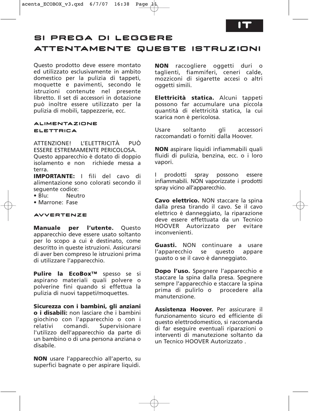MANUALE UTENTE ACENTA BAGLESS HOOVER
