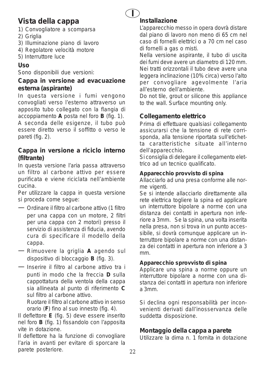 L’apparecchio messo in opera dovrà distare dal piano di lavoro non meno di 65 cm nel caso di fornelli elettrici o a 70 cm nel caso di fornelli a gas o misti. Nella versione aspirante, il tubo di uscita dei fumi deve avere un diametro di 120 mm. Nei tratti orizzontali il tubo deve avere una leggera inclinazione (10% circa) verso l’alto per convogliare agevolmente l’aria all’esterno dell’ambiente. Do not tile, grout or silicone this appliance to the wall. Surface mounting only. Convogliatore a scomparsa Griglia Illuminazione piano di lavoro Regolatore velocità motore Interruttore luce Uso Sono disponibili due versioni: Cappa in versione ad evacuazione esterna (aspirante) In questa versione i fumi vengono convogliati verso l’esterno attraverso un apposito tubo collegato con la flangia di accoppiamento A posta nel foro B (fig. 1). A seconda delle esigenze, il tubo può essere diretto verso il soffitto o verso le pareti (fig. 2). Cappa in versione a riciclo interno (filtrante) In questa versione l’aria passa attraverso un filtro al carbone attivo per essere purificata e viene riciclata nell’ambiente cucina. Per utilizzare la cappa in questa versione si proceda come segue: — Ordinare il filtro al carbone attivo (1 filtro per una cappa con un motore, 2 filtri per una cappa con 2 motori) presso il servizio di assistenza di fiducia, avendo cura di specificare il modello della cappa. — Rimuovere la griglia A agendo sul dispositivo di bloccaggio B (fig. 3). — Inserire il filtro al carbone attivo tra i punti in modo che la freccia D sulla cappottatura della ventola della cappa sia allineata al punto di riferimento C sul filtro al carbone attivo. Ruotare il filtro al carbone attivo in senso orario (F) fino al suo innesto (fig. 4). Il deflettore E (fig. 5) deve essere inserito nel foro B (fig. 1) fissandolo con l’apposita vite in dotazione. Il deflettore ha la funzione di convogliare l’aria in avanti per evitare di sporcare la parete posteriore.
