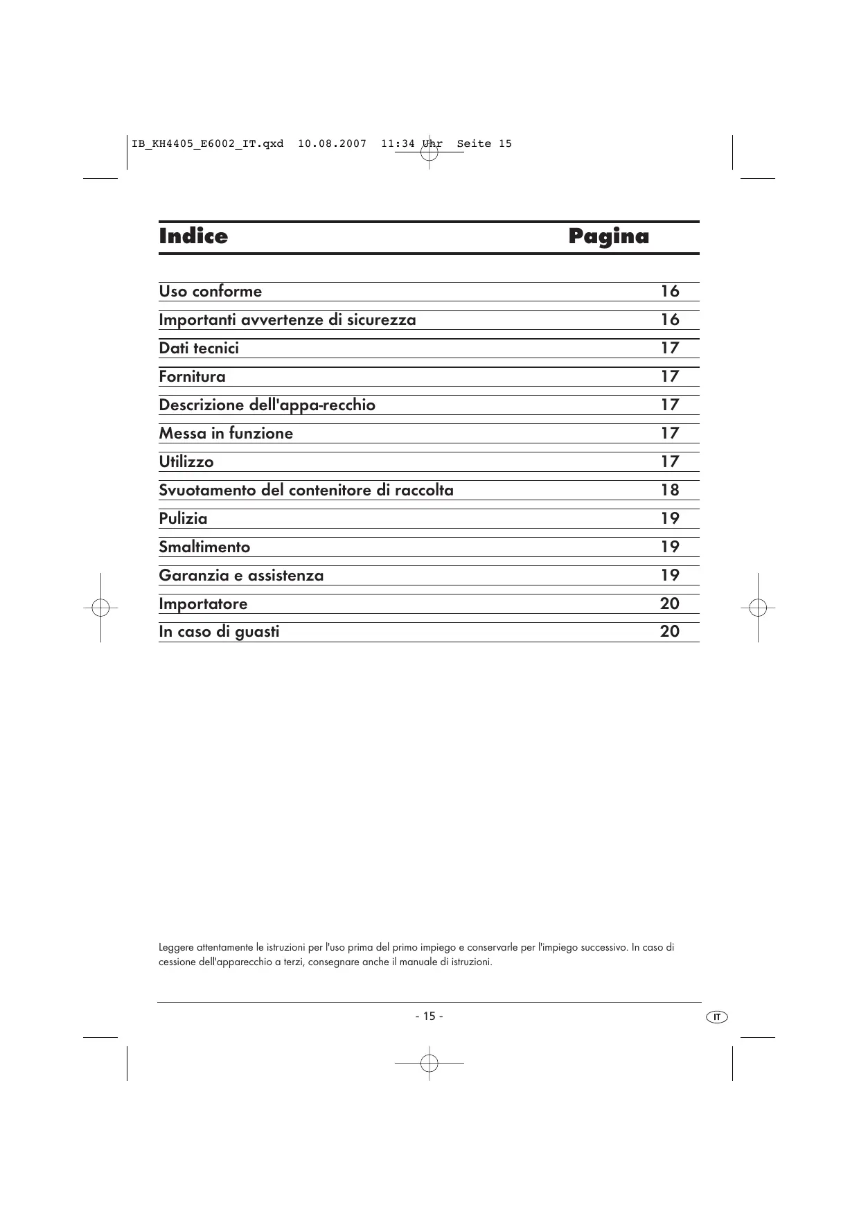 Attenzione: estrarre la spina dalla presa di corrente per evitare un'accensione involontaria. Svuotare il contenitore di raccolta t/u. Fare raffreddare l'apparecchio. Reinserire la spina nella presa. Accendere l'apparecchio spostando l'interruttore w in posizione . IB_KH4405_E6002_IT.qxd