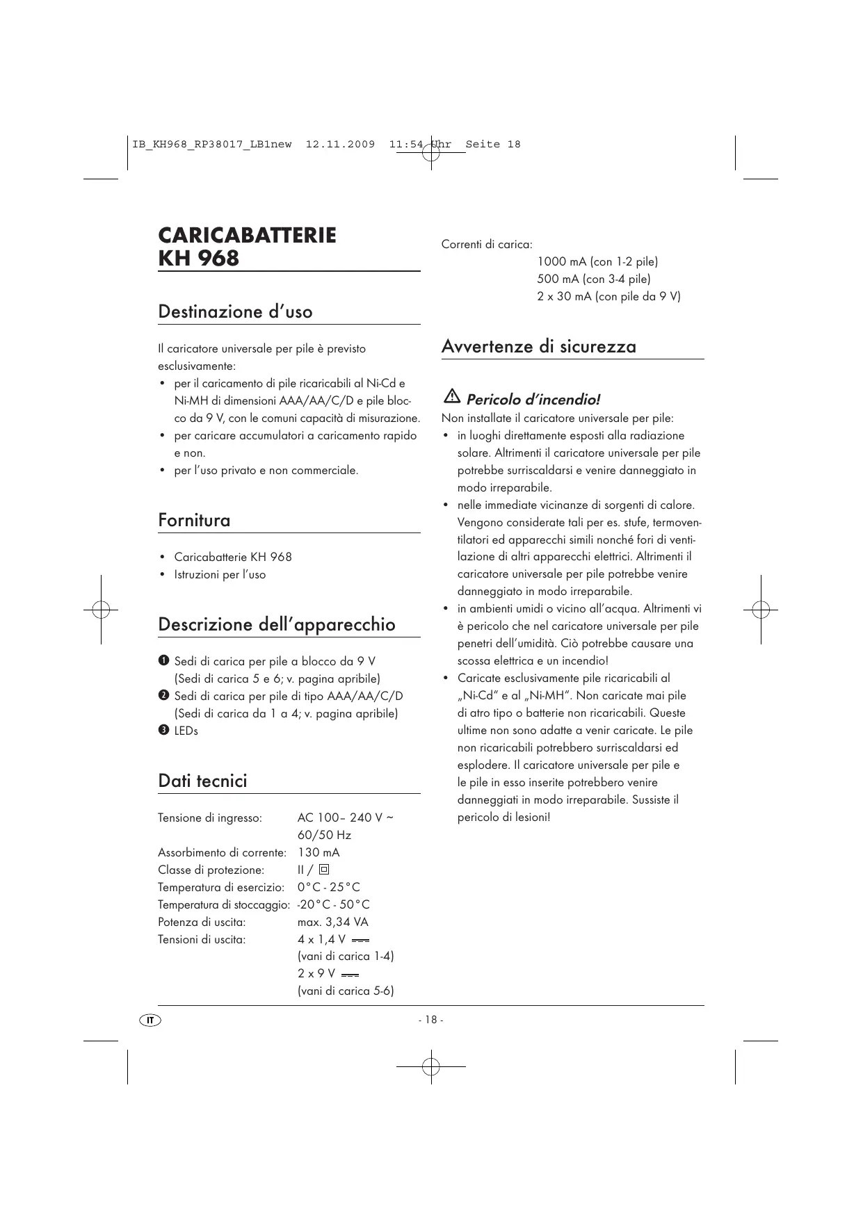 Fornitura • Caricabatterie KH 968 • Istruzioni per l’uso