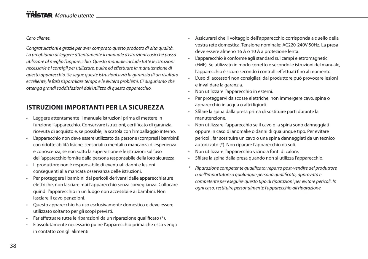 Tristar non è responsable di danni materiali o lesions personali causate da un uso improprio o da un mancato rispetto delle istruzioni di sicurezza. - La pulizia eseguita seconde leindicazioni di questo manuale è l'unica manutenzione necessaria per questo apparecchio.