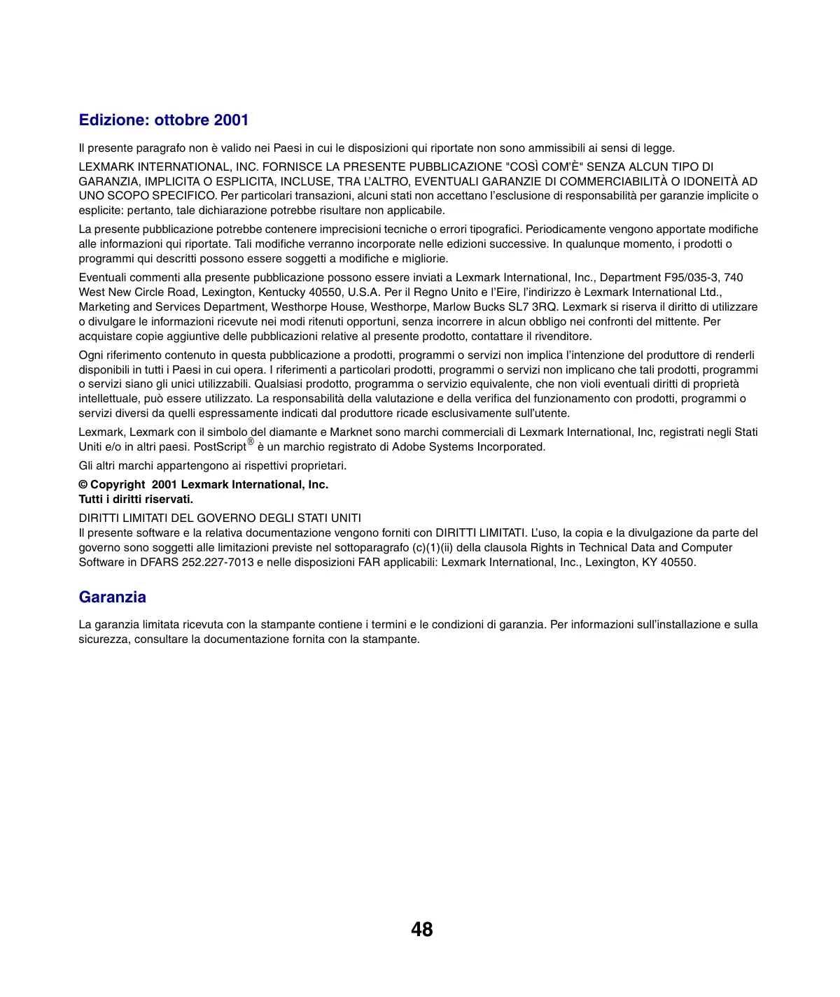 Edizione: ottobre 2001 Il presente paragrafo non è valido nei Paesi in cui le disposizioni qui riportate non sono ammissibili ai sensi di legge. LEXMARK INTERNATIONAL, INC. FORNISCE LA PRESENTE PUBBLICAZIONE "COSÌ COM’È" SENZA ALCUN TIPO DI GARANZIA, IMPLICITA O ESPLICITA, INCLUSE, TRA L’ALTRO, EVENTUALI GARANZIE DI COMMERCIABILITÀ O IDONEITÀ AD UNO SCOPO SPECIFICO. Per particolari transazioni, alcuni stati non accettano l’esclusione di responsabilità per garanzie implicite o esplicite: pertanto, tale dichiarazione potrebbe risultare non applicabile. La presente pubblicazione potrebbe contenere imprecisioni tecniche o errori tipografici. Periodicamente vengono apportate modifiche alle informazioni qui riportate. Tali modifiche verranno incorporate nelle edizioni successive. In qualunque momento, i prodotti o programmi qui descritti possono essere soggetti a modifiche e migliorie. Eventuali commenti alla presente pubblicazione possono essere inviati a Lexmark International, Inc., Department F95/035-3, 740 West New Circle Road, Lexington, Kentucky 40550, U.S.A. Per il Regno Unito e l’Eire, l’indirizzo è Lexmark International Ltd., Marketing and Services Department, Westhorpe House, Westhorpe, Marlow Bucks SL7 3RQ. Lexmark si riserva il diritto di utilizzare o divulgare le informazioni ricevute nei modi ritenuti opportuni, senza incorrere in alcun obbligo nei confronti del mittente. Per acquistare copie aggiuntive delle pubblicazioni relative al presente prodotto, contattare il rivenditore. Ogni riferimento contenuto in questa pubblicazione a prodotti, programmi o servizi non implica l’intenzione del produttore di renderli disponibili in tutti i Paesi in cui opera. I riferimenti a particolari prodotti, programmi o servizi non implicano che tali prodotti, programmi o servizi siano gli unici utilizzabili. Qualsiasi prodotto, programma o servizio equivalente, che non violi eventuali diritti di proprietà intellettuale, può essere utilizzato. La responsabilità della valutazione e della verifica del funzionamento con prodotti, programmi o servizi diversi da quelli espressamente indicati dal produttore ricade esclusivamente sull’utente. Lexmark, Lexmark con il simbolo del diamante e Marknet sono marchi commerciali di Lexmark International, Inc, registrati negli Stati Uniti e/o in altri paesi. PostScript® è un marchio registrato di Adobe Systems Incorporated. Gli altri marchi appartengono ai rispettivi proprietari. © Copyright 2001 Lexmark International, Inc. Tutti i diritti riservati. DIRITTI LIMITATI DEL GOVERNO DEGLI STATI UNITI Il presente software e la relativa documentazione vengono forniti con DIRITTI LIMITATI. L’uso, la copia e la divulgazione da parte del governo sono soggetti alle limitazioni previste nel sottoparagrafo (c)(1)(ii) della clausola Rights in Technical Data and Computer Software in DFARS 252.227-7013 e nelle disposizioni FAR applicabili: Lexmark International, Inc., Lexington, KY 40550. Garanzia La garanzia limitata ricevuta con la stampante contiene i termini e le condizioni di garanzia. Per informazioni sull’installazione e sulla sicurezza, consultare la documentazione fornita con la stampante.