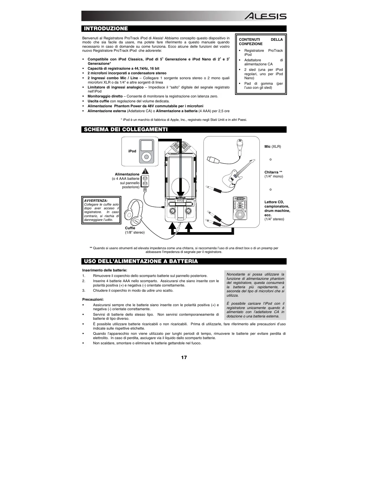 Benvenuti al Registratore ProTrack iPod di Alesis! Abbiamo concepito quello dispositivo in modo che sua facile da usare, ma potetefare riferimento a questo manuale quando necessario in caso di domande su come funziona. Ecco alcune delle funzioni del vostro nuovo Registratore ProTrack iPod che adorerete:
