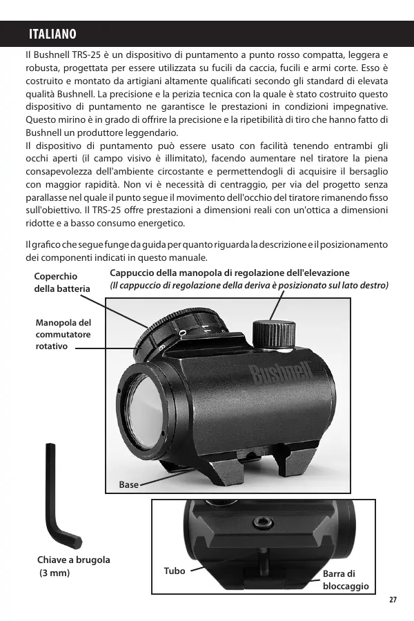 Italiano Il Bushnell TRS-25 è un dispositivo di puntamento a punto rosso compatta, leggera e robusta, progettata per essere utilizzata su fucili da caccia, fucili e armi corte. Esso è costruito e montato da artigiani altamente qualificati secondo gli standard di elevata qualità Bushnell. La precisione e la perizia tecnica con la quale è stato costruito questo dispositivo di puntamento ne garantisce le prestazioni in condizioni impegnative. Questo mirino è in grado di offrire la precisione e la ripetibilità di tiro che hanno fatto di Bushnell un produttore leggendario. Il dispositivo di puntamento può essere usato con facilità tenendo entrambi gli occhi aperti (il campo visivo è illimitato), facendo aumentare nel tiratore la piena consapevolezza dell'ambiente circostante e permettendogli di acquisire il bersaglio con maggior rapidità. Non vi è necessità di centraggio, per via del progetto senza parallasse nel quale il punto segue il movimento dell'occhio del tiratore rimanendo fisso sull'obiettivo. Il TRS-25 offre prestazioni a dimensioni reali con un'ottica a dimensioni ridotte e a basso consumo energetico. Il grafico che segue funge da guida per quanto riguarda la descrizione e il posizionamento dei componenti indicati in questo manuale. Cappuccio della manopola di regolazione dell'elevazione Coperchio (Il cappuccio di regolazione della deriva è posizionato sul lato destro) della batteria Manopola del commutatore rotativo Base Chiave a brugola (3 mm) Tubo Barra di bloccaggio