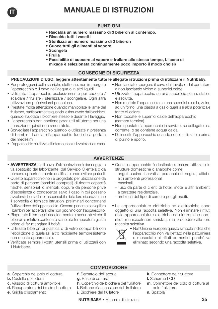 - des coins cuisines réservés au personnel dans les magasins, bureaux et autres environnements professionnels, - des fermes, - l’utilisation par les clients des hôtels, motels et autres environnements à caractère résidentiel, - des environnements du type de chambres d’hôtes. • Utilisez des biberons en plastique ou en verre pouvant bouillir ou tous autres récipients thermorésistants avec cet appareil. • Vérifiez toujours vos ustensiles avant de les employer avec le Nutribaby. • Les équipements électriques et électroniques font l’objet d’une collecte sélective. Ne pas se débarrasser des déchets d’équipements électriques et électroniques avec les déchets municipaux non triés, mais procéder à leur collecte sélective. • Ce symbole indique à travers l’Union Européenne que ce produit ne doit pas être jeté à la poubelle ou mélangé aux ordures ménagères, mais faire l’objet d’une collecte sélective.