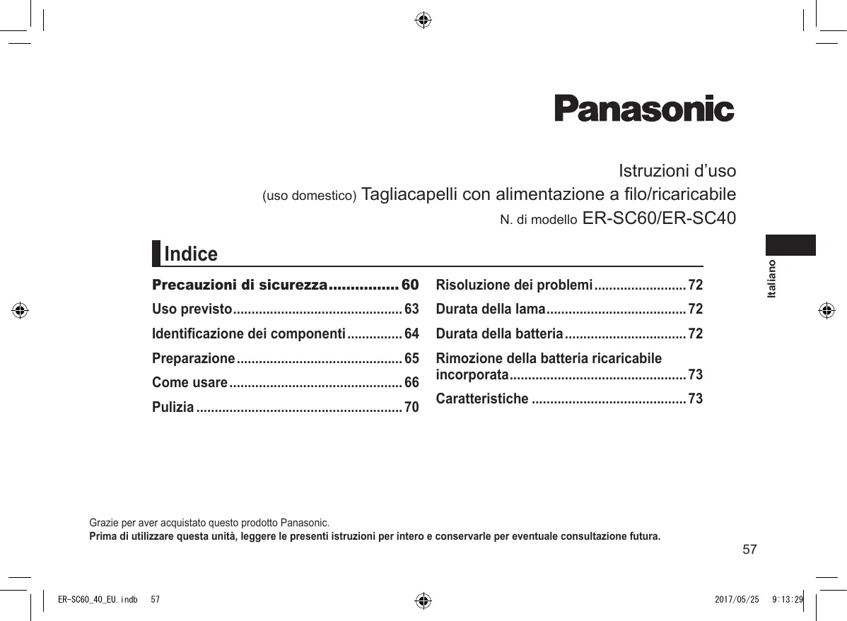 - 2017/05/25 9:13:29 Istruzioni d’uso (uso domestico) Tagliacapelli con alimentazione a filo/ricaricabile N. di modello ER‑SC60/ER‑SC40 Precauzioni di sicurezza p. 60