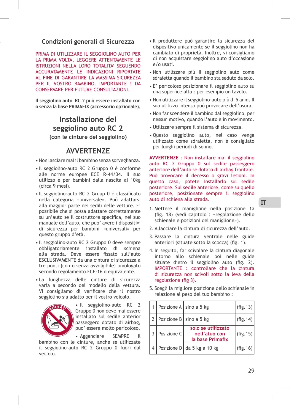 • El largo de los cinturones de seguridad varía según cada modelo de automóvil. Sugerimos que compruebe que esta silla grupo 0 puede utilizarse en su vehículo. • La silla Grupo 0 RC 2 nunca debe situarse en asientos delanteros equipados con “airbag”, esto podría ser muy peligroso. • Asegure SIEMPRE a su bebé con el arnés de seguridad de la silla Grupo 0 RC 2 aún si no la utiliza en el automóvil. • El fabricante sólo puede garantizar la seguridad de la silla grupo 0 cuando es utilizado por el primer propietario. Sugerimos que no utilice un