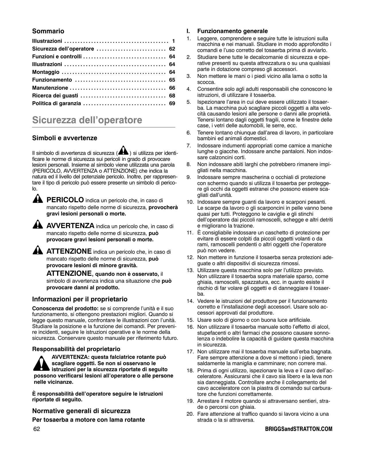 Cette garantie ne couvre que les défauts de matière ou de construction liés au produit. Afin d’éviter tout malentendu entre le client et le Réparateur Agréé, sont énumérées ci-après certaines des causes de défaillance des produits qui ne sont pas couvertes par la garantie. • Usure normale: les appareils équipés de petits moteurs, comme tous les appareils mécaniques, nécessitent un entretien régulier et le remplacement des pièces d’usure pour fonctionner correctement. Cette garantie ne couvre pas la réparation de pièces ou de produits dont l’usure provient d’un usage normal. • Installation: cette garantie ne s’applique pas à un produit ayant fait l’objet d’une installation, altération ou modification inappropriée ou interdite ni aux installations qui empêchent le démarrage et entraînent de mauvaises performances du moteur. • Entretien inadéquat: la durée de vie de ce produit dépend des conditions dans lesquelles il est utilisé et de l’entretien qu’il reçoit. Les intervalles d’entretien et de réglage recommandés sont indiqués dans le manuel d’utilisation. Les produits tels que motoculteurs, dressebordures ou tondeuses rotatives, sont utilisés dans un environnement poussiéreux ou sale, pouvant être la cause d’une usure qui peut sembler prématurée. Une telle usure, lorsqu’elle est consécutive à l’entrée de poussière, sable ou autre produit abrasif en raison d’un mauvais entretien, n’est pas couverte par la garantie. De même, la garantie ne couvre pas les réparations dues à des problèmes découlant du remplacement de pièces par des pièces non d’origine. • Insuffisance ou erreur de carburant ou de lubrifiant: cette garantie ne couvre pas les dommages provoqués par l’utilisation de carburants éventés ou d’essences modifiées. Les dommages subis par le moteur ou ses composants, à savoir chambre de combustion, soupapes, sièges de soupape, guides de soupape ou bobinage du démarreur grillé, suite à l’emploi de carburants de substitution tels que pétrole liquéfié ou gaz naturel, ne sont pas couverts à moins que le moteur ne soit certifié pour cet usage. Les pièces qui seraient rayées ou cassées du fait d’un manque d’huile ou d’une huile polluée ou dont le degré de viscosité est inadéquat, ainsi que les composants endommagés en raison d’un manque de lubrification ne sont pas couverts. • Utilisation inadéquate: le fonctionnement approprié du produit est stipulé dans le manuel d’utilisation. Ne sont pas couverts les cas suivants. Produit endommagé suite à un sur-régime, une surchauffe ou une utilisation dans un espace confiné où la ventilation est insuffisante. Bris du produit dû à des vibrations excessives résultant d’un serrage insuffisant des boulons de fixation du moteur, d’une lame ou turbine desserrée ou mal équilibrée, d’un sur-régime ou d’un vilebrequin faussé suite à un choc sur un corps dur. Dommages ou dysfonctionnements résultant d’accidents, utilisation abusive, mauvais entretien, gel, détérioration chimique ainsi qu’usage en dehors des capacités recommandées stipulées dans le manuel d’utilisation. • Mise au point normale, éléments d’usure ou réglages: cette garantie exclut les éléments d’usure tels que notamment huile, courroies, lames, joints toriques, filtres. Les interventions sous garantie ne sont effectuées que par les Réparateurs Agréés. Recherchez-les dans la liste des Réparateurs sur notre site Internet BRIGGSandSTRATTON.COM