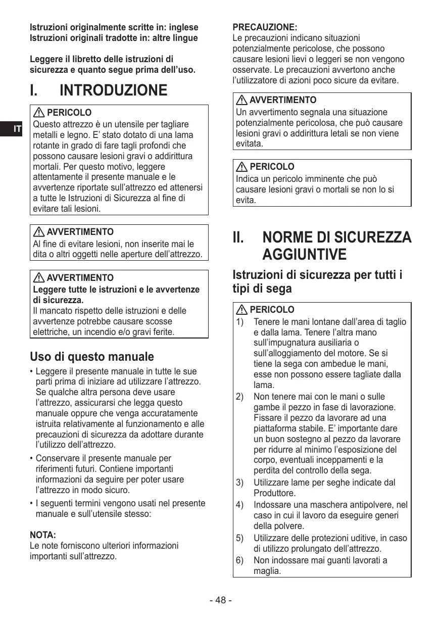 Questo attrezzo è un utensile per tagliare metalli e legno. E' stato dotato di una lama rotante in grado di fare tagli profondi che possono causare lesioni gravi o addirittura mortali. Per questo motivo, leggere attendamente il presente manuale e le avventenze riportate sull'attrezzo ed attenersi a tutte le Istruzioni di Sicurezza al fine di evitare tali lesioni.