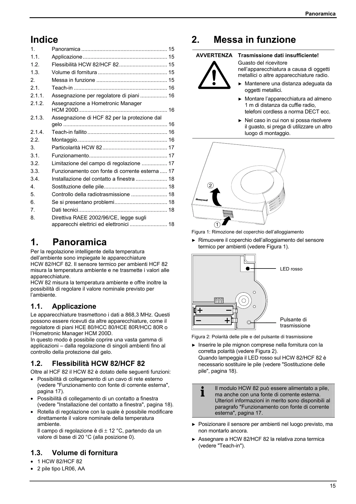 Panoramica 15 Applicazione 15 Flessibilità HCW 82/HCF 82 15 Volume di fornitura 15 Messa in funzione 15 Teach-in 16 Assegnazione per regolatore di piani 16 Assegnazione a Hometronic Manager HCM 200D 16 Assegnazione di HCF 82 per la protezione dal gelo 16 Teach-in fallito 16 Montaggio 16 Particolarità HCW 82 17 Funzionamento 17 Limitazione del campo di regolazione 17 Funzionamento con fonte di corrente esterna 17 Installazione del contatto a finestra 18 Sostituzione delle pile 18 Controllo della radiotrasmissione 18 Se si presentano problemi 18 Dati tecnici 18 Direttiva RAEE 2002/96/CE, legge sugli apparecchi elettrici ed elettronici 18