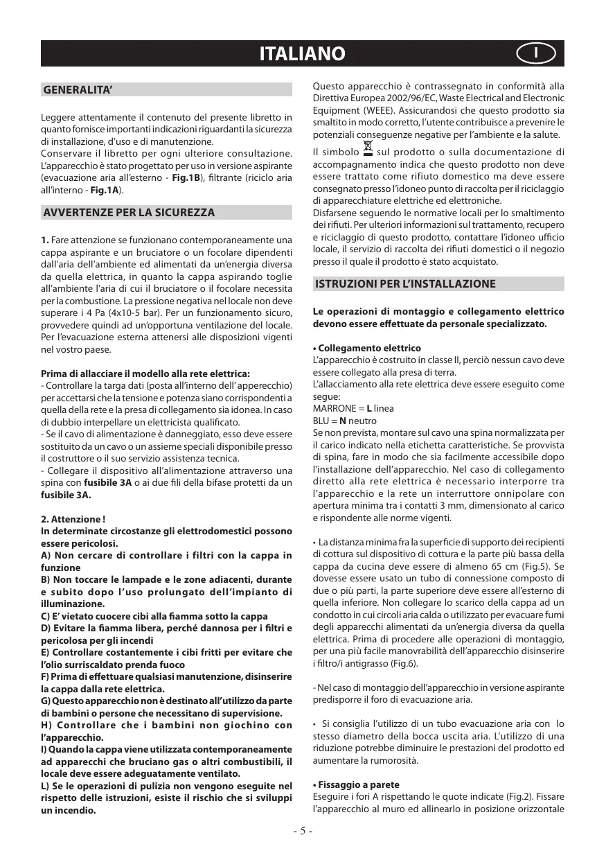 • Connexion électrique L’appareil est construit en classe II, pour cela aucun cable ne doit être connecté avec la prise terre. La connection avec le réseau électrique doit être éxécutée comme suit: MARRON = L ligne BLEU = N neutre Si elle n’a pas été prévue, monter sur le cable une fiche normalisée pour la charge indiquée sur l’etiquette des caractéristiques. Si elle est dotée d’une fiche, la hotte doit être installée en sorte que la fiche soit accessible. En cas de connection directe avec le réseau électrique, il est nécessaire d’interposer entre l’appareil et le réseau un interrupteur omnipolaire avec une ouverture minimale entre les contacts de 3 mm, proportionnel à la charge et correspondant aux normes en vigueur. • La distance minimum entre la surface de support des récipients de cuisson sur le dispositif de cuisson et la partie la plus basse de la hotte pour cuisine doit être de 65 cm au moins (Fig.5). S’il doit être utilisé un tuyau de connection composé de deux ou plusieurs parties, la partie superieure doit être à l’exterieur de celle inférieure. Ne pas relier le tuyau d’échappement de la hotte à un conduit dans lequel circule de l’air chaud ou employé pour évacuer les fumées des appareils alimentés par une énergie differente de celle électrique. En vue d’une manœuvrabilité de l’appareil plus facile, avant d’exécuter les opérations de montage, déconnecter le filtre/ les filtres anti-graisse (Fig.6). S’il s’agit d’une hotte aspirante, il faudra prévoir une ouverture pour l’évacuation de l’air. • Nous conseillons d’utiliser un tuyau d’évacuation de l’air de même diamètre que l’orifice de sortie de l’air. L’utilisation d’une