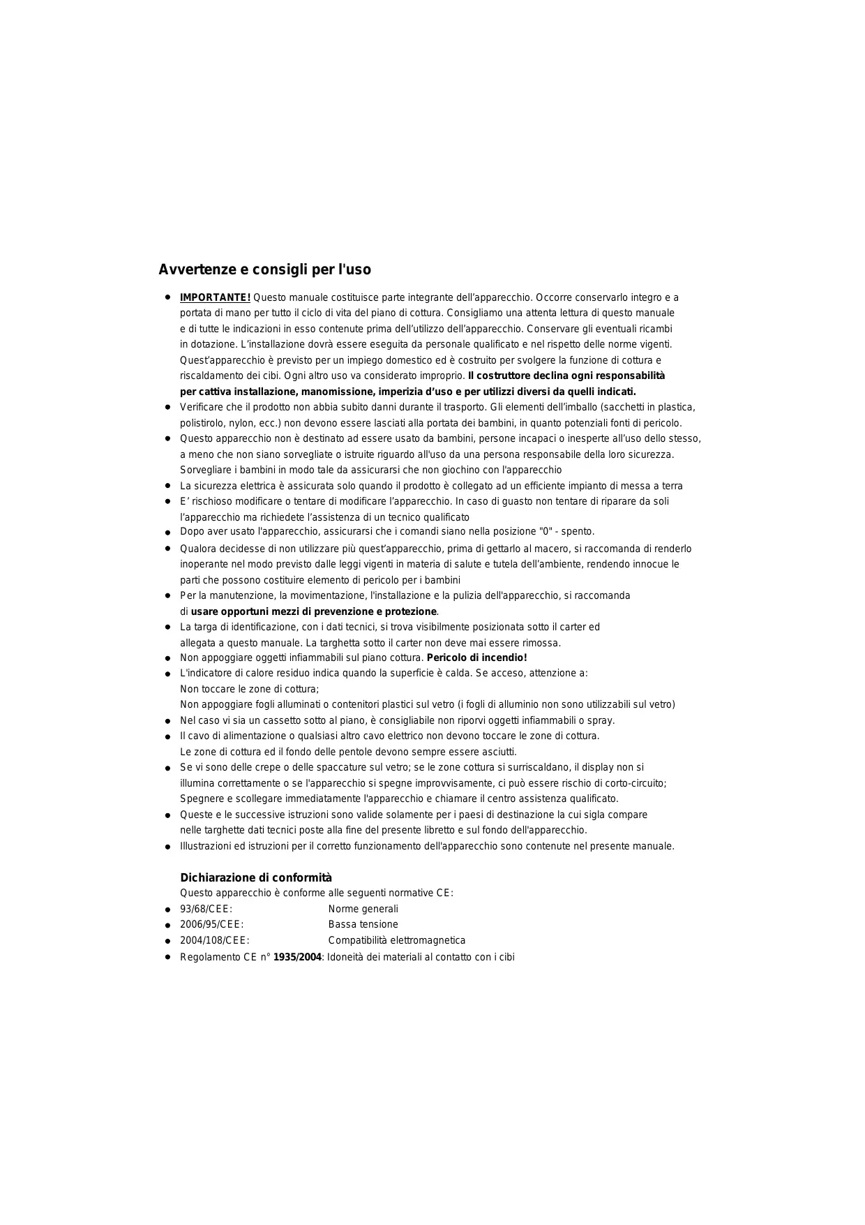 - IMPORTANTE! Questo manuale costituisse parte integrante dell'apparecchio. Occorre conservarlo integro e a portata di mano per tutto il ciclo di vita del piano di cottura. Consigliamo una attentalettura di questo manuale e di tutte leindicazioni inesso contente prima dell'utilizzo dell'apparecchio.Conservare gli eventuali ricambi in dotazione.L'infallazione dovraressereseguita da personale qualificato e nel rispetto dellenorme vigenti. Quest'apparecchio è previsto per un impiego domestico ed è costruito per svolgere la funzione di cottura e riscaldamento dei cibi.Ogni altruso va considerato improprio. Il costruttore declina agli responsabilita per cattiva installazione,manomissione,imperizia d'uso e perutilizzidiversi da quelli indicati.