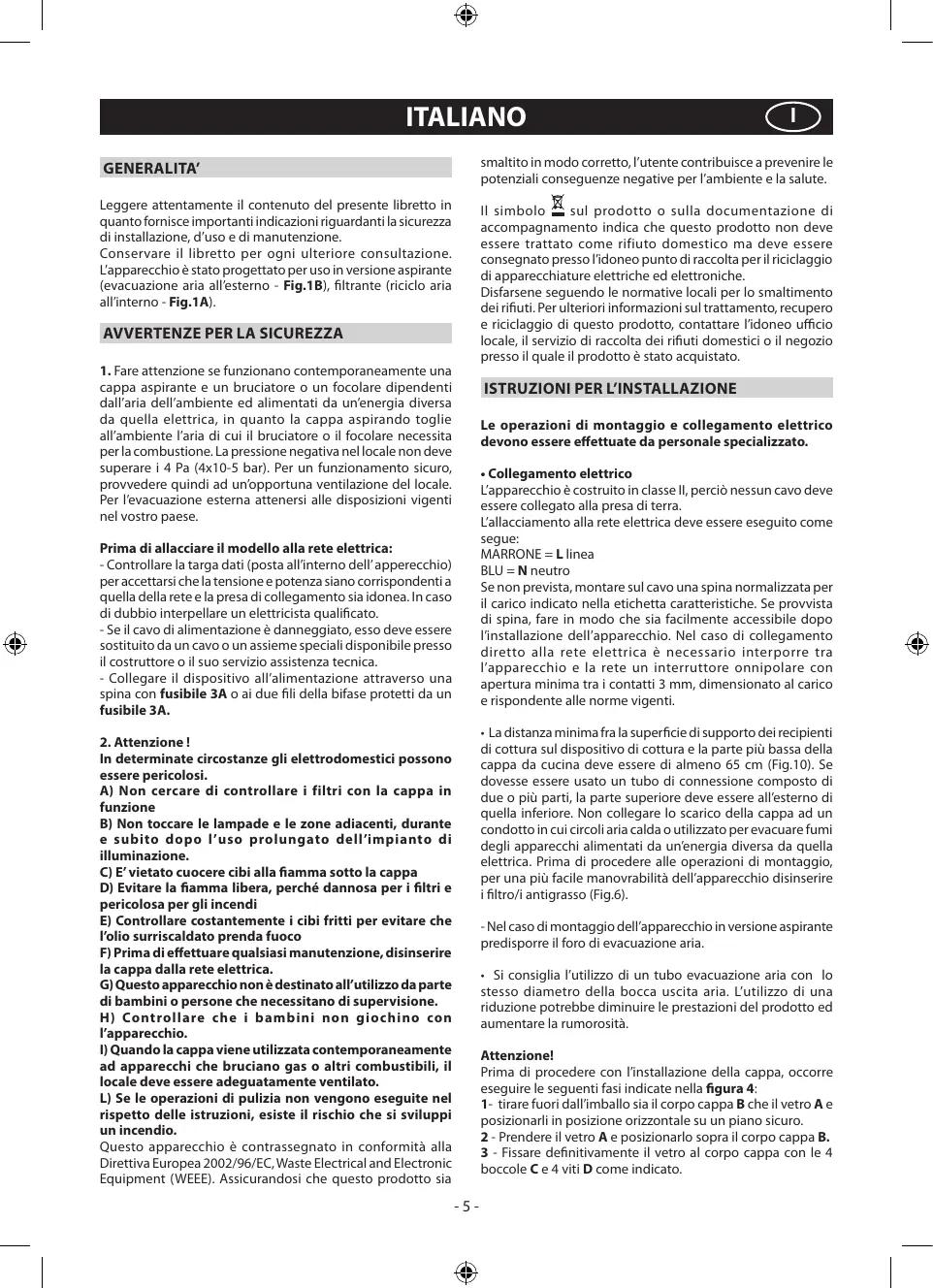 Leggere attentamente il contenuto del presente libretto in quanto fornisce importanti indicazioni riguardanti la sicurezza di installazione, d’uso e di manutenzione. Conservare il libretto per ogni ulteriore consultazione. L’apparecchio è stato progettato per uso in versione aspirante (evacuazione aria all’esterno - Fig.1B), filtrante (riciclo aria all’interno - Fig.1A).