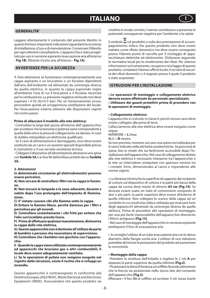 I) Quando la cappa viene utilizzata contemporaneamente ad apparecchi che bruciano gas o altri combustibili, il locale deve essere adequatamente ventilato.