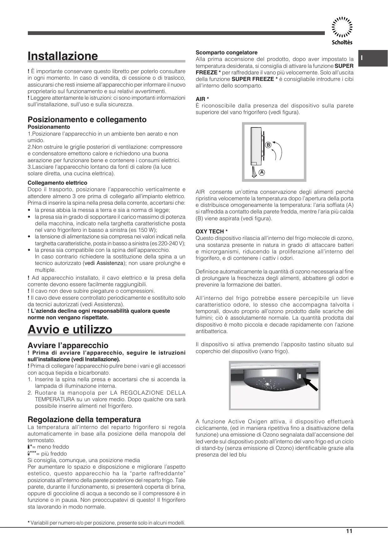 Scomparto congelatore Alla prima accensione del prodotto, dopo aver impostato la temperatura desiderata, si consiglia di attivare la funzione SUPER FREEZE * per raffreddare il vano più velocemente. Solo all’uscita della funzione SUPER FREEZE * è consigliabile introdurre i cibi all’interno dello scomparto. AIR * È riconoscibile dalla presenza del dispositivo sulla parete superiore del vano frigorifero (vedi figura).