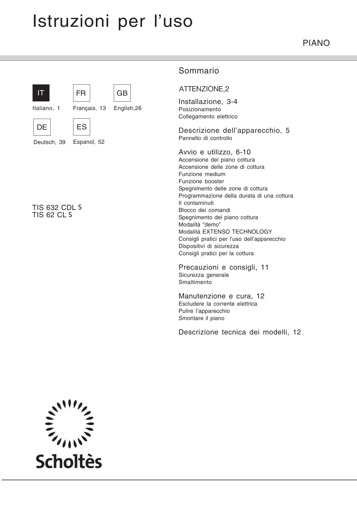 TIS 62 C L S - Piano cottura SCHOLTES - Manuale utente e istruzioni gratuiti