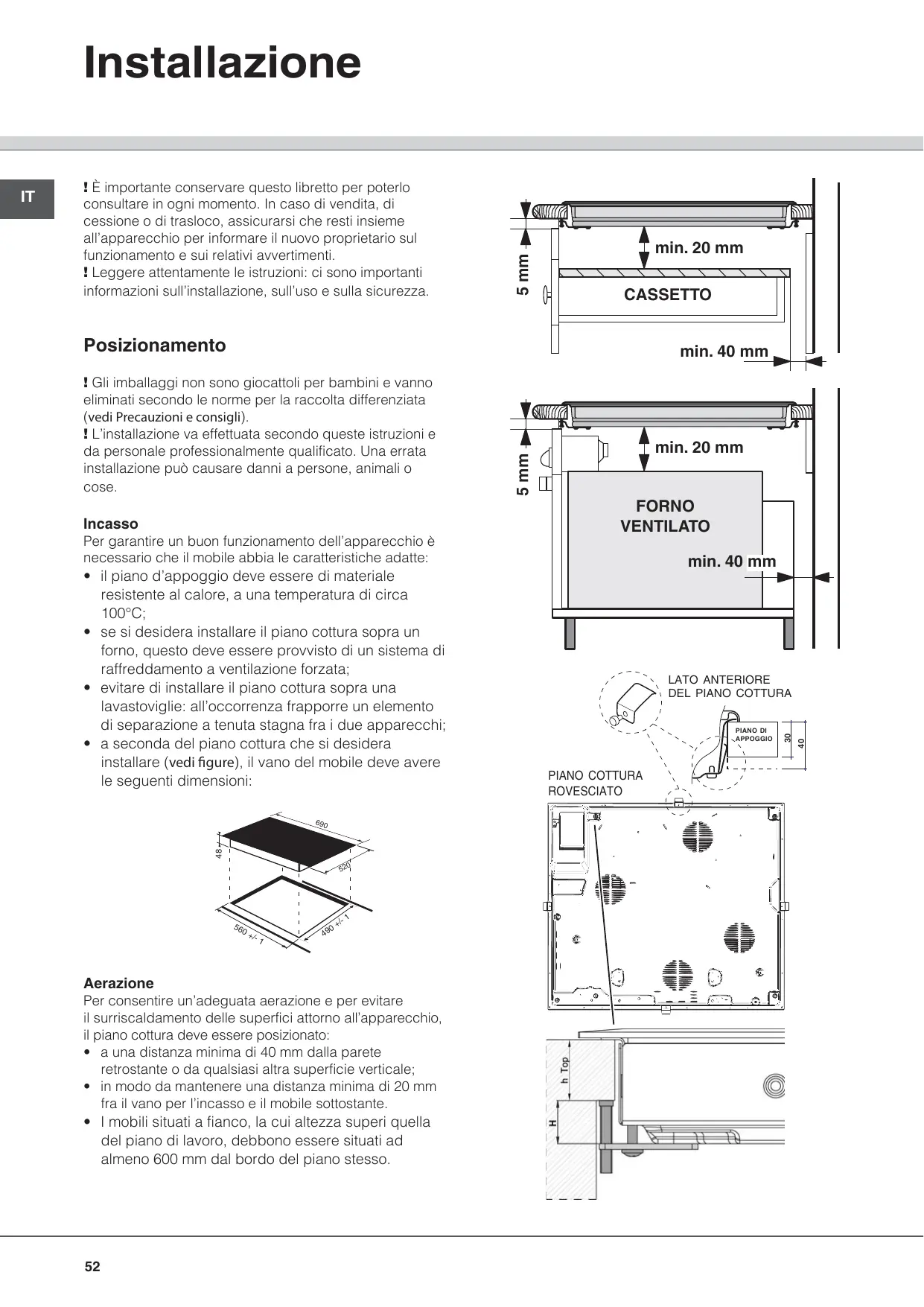 Aerazione Per consentire un’adeguata aerazione e per evitare il surriscaldamento delle superfici attorno all’apparecchio, il piano cottura deve essere posizionato: • a una distanza minima di 40 mm dalla parete retrostante o da qualsiasi altra superficie verticale; • in modo da mantenere una distanza minima di 20 mm fra il vano per l’incasso e il mobile sottostante.