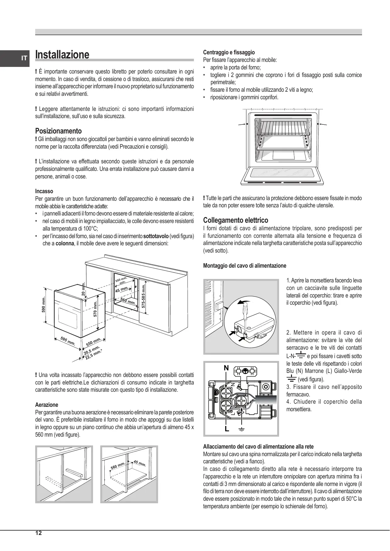 - per l’incasso del forno, sia nel caso di inserimento sottotavolo (vedi figura) che a colonna, il mobile deve avere le seguenti dimensioni: ! Tutte le parti che assicurano la protezione debbono essere fissate in modo tale da non poter essere tolte senza l’aiuto di qualche utensile. Collegamento elettrico I forni dotati di cavo di alimentazione tripolare, sono predisposti per il funzionamento con corrente alternata alla tensione e frequenza di alimentazione indicate nella targhetta caratteristiche posta sull’apparecchio (vedi sotto). Montaggio del cavo di alimentazione