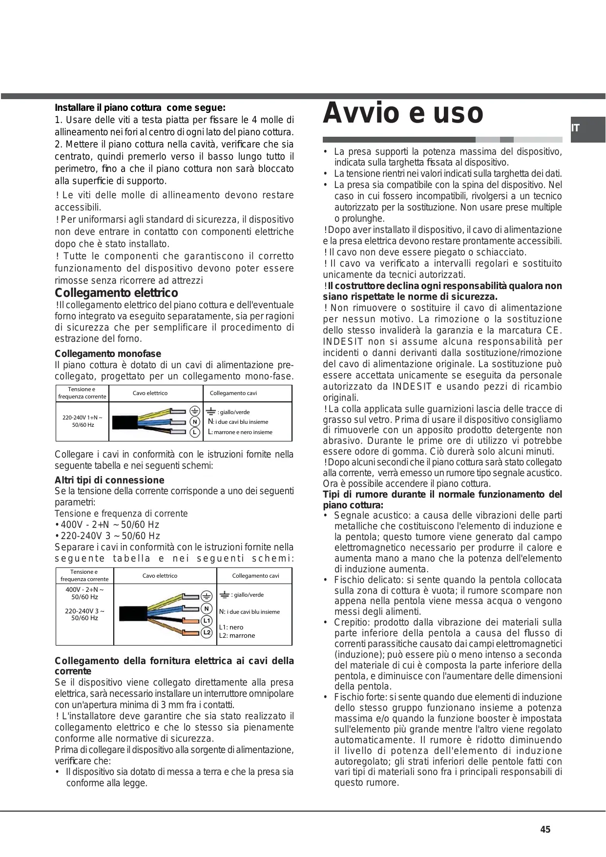 - La presa sia compatibile con la spina del dispositivo. Nel caso in cui fossero incompatibili, rivolgersi a un tecnico autorizzato per la sostituzione. Non usare prese multiple o prolunghe. ! Dopo aver installato il dispositivo, il cavo di alimentazione e la presa elettrica devono restare prontamente accessibili. ! Il cavo non deve essere piegato o schiacciato. ! Il cavo va verificato a intervalli regolari e sostituito unicamente da tecnici autorizzati. ! Il costruttore declina ogni responsabilità qualora non siano rispettate le norme di sicurezza. ! Non rimuovere o sostituire il cavo di alimentazione per nessun motivo. La rimozione o la sostituzione dello stesso invaliderà la garanzia e la marcatura CE. INDESIT non si assume alcuna responsabilità per incidenti o danni derivanti dalla sostituzione/rimozione del cavo di alimentazione originale. La sostituzione può essere accettata unicamente se eseguita da personale autorizzato da INDESIT e usando pezzi di ricambio originali. ! La colla applicata sulle guarnizioni lascia delle tracce di grasso sul vetro. Prima di usare il dispositivo consigliamo di rimuoverle con un apposito prodotto detergente non abrasivo. Durante le prime ore di utilizzo vi potrebbe essere odore di gomma. Ciò durerà solo alcuni minuti. ! Dopo alcuni secondi che il piano cottura sarà stato collegato alla corrente, verrà emesso un rumore tipo segnale acustico. Ora è possibile accendere il piano cottura. Tipi di rumore durante il normale funzionamento del piano cottura: