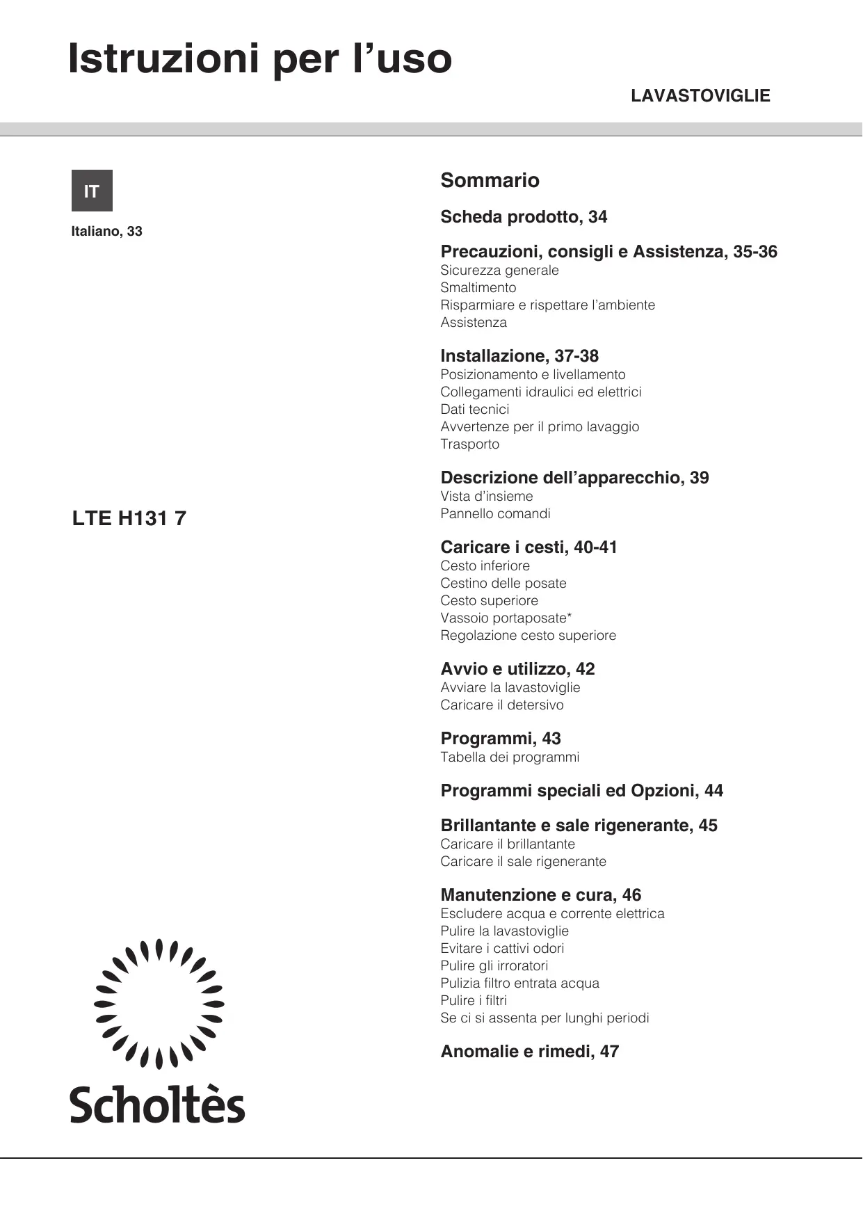 Italiano, 33 Sommario Scheda prodotto, 34 Precauzioni, consigli e Assistenza, 35-36 Sicurezza generale Smaltimento Risparmiare e rispettare l’ambiente Assistenza Installazione, 37-38 Posizionamento e livellamento Collegamenti idraulici ed elettrici Dati tecnici Avvertenze per il primo lavaggio Trasporto Descrizione dell’apparecchio, 39 LTE H131 7 Vista d’insieme Pannello comandi Caricare i cesti, 40-41 Cesto inferiore Cestino delle posate Cesto superiore Vassoio portaposate* Regolazione cesto superiore Avvio e utilizzo, 42 Avviare la lavastoviglie Caricare il detersivo Programmi, 43 Tabella dei programmi Programmi speciali ed Opzioni, 44 Brillantante e sale rigenerante, 45 Caricare il brillantante Caricare il sale rigenerante Manutenzione e cura, 46 Escludere acqua e corrente elettrica Pulire la lavastoviglie Evitare i cattivi odori Pulire gli irroratori Pulizia filtro entrata acqua Pulire i filtri Se ci si assenta per lunghi periodi Anomalie e rimedi, 47