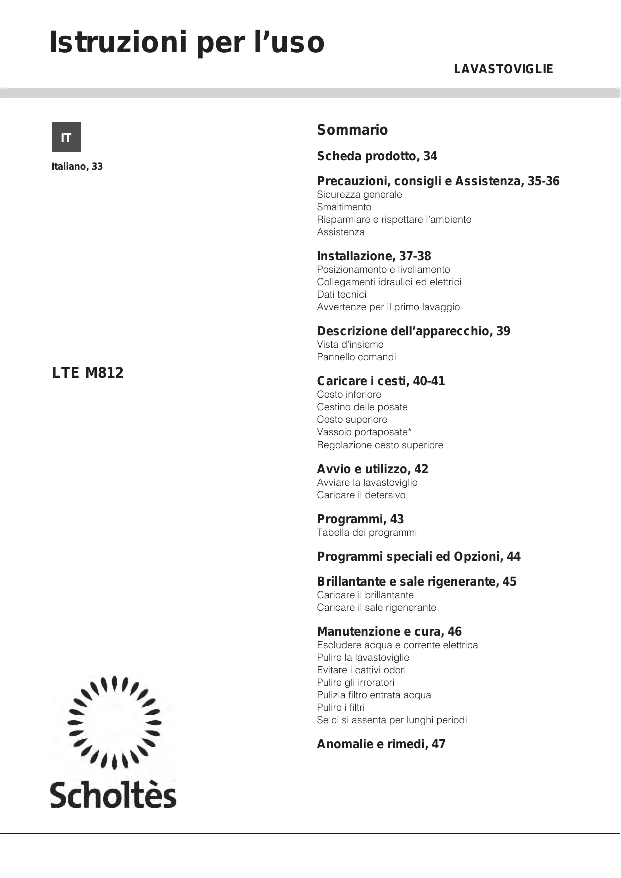 Italiano, 33 Sommario Scheda prodotto, 34 Precauzioni, consigli e Assistenza, 35-36 Sicurezza generale Smaltimento Risparmiare e rispettare l’ambiente Assistenza Installazione, 37-38 Posizionamento e livellamento Collegamenti idraulici ed elettrici Dati tecnici Avvertenze per il primo lavaggio Descrizione dell’apparecchio, 39 Vista d’insieme Pannello comandi LTE M812 Caricare i cesti, 40-41 Cesto inferiore Cestino delle posate Cesto superiore Vassoio portaposate* Regolazione cesto superiore Avvio e utilizzo, 42 Avviare la lavastoviglie Caricare il detersivo Programmi, 43 Tabella dei programmi Programmi speciali ed Opzioni, 44 Brillantante e sale rigenerante, 45 Caricare il brillantante Caricare il sale rigenerante Manutenzione e cura, 46 Escludere acqua e corrente elettrica Pulire la lavastoviglie Evitare i cattivi odori Pulire gli irroratori Pulizia filtro entrata acqua Pulire i filtri Se ci si assenta per lunghi periodi Anomalie e rimedi, 47