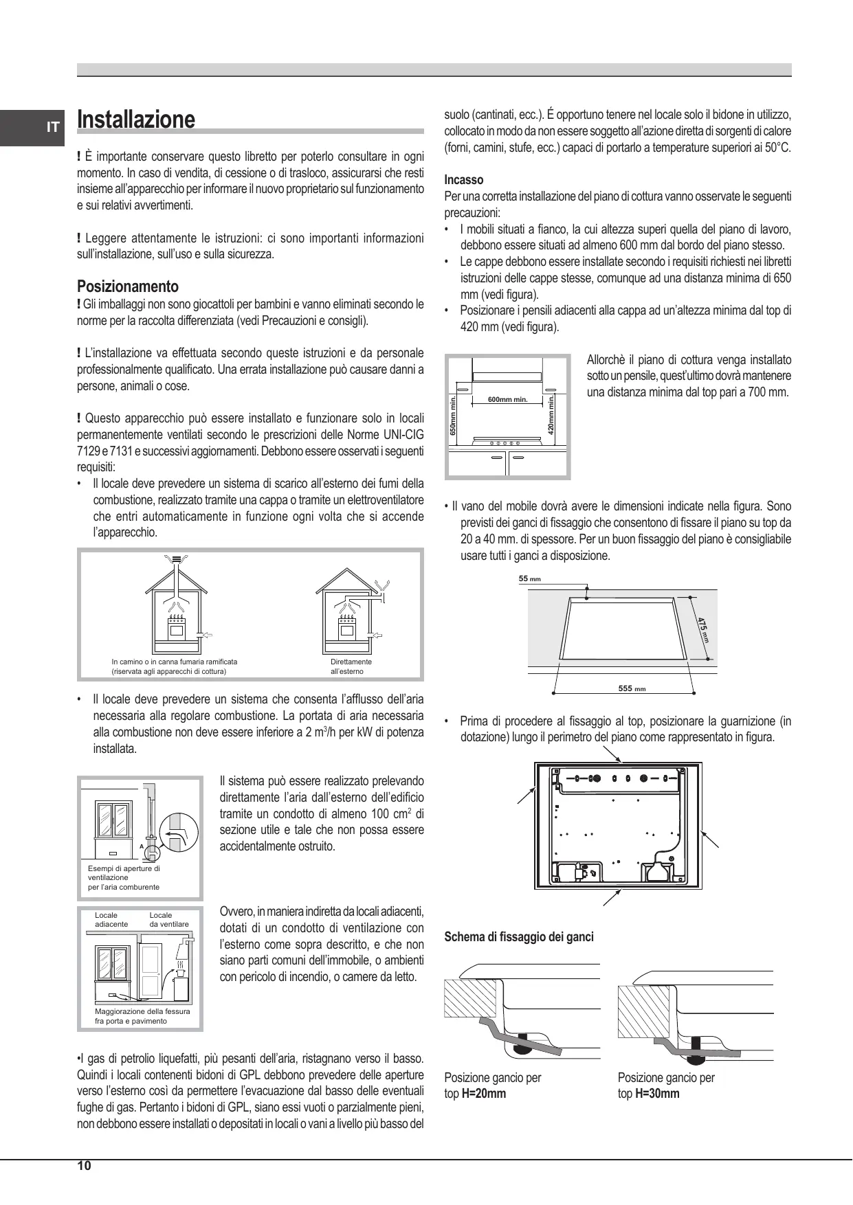 Installazione ! È importante conservare questo libretto per poterlo consultare in ogni momento. In caso di vendita, di cessione o di trasloco, assicurarsi che resti insieme all’apparecchio per informare il nuovo proprietario sul funzionamento e sui relativi avvertimenti. suolo (cantinati, ecc.). É opportuno tenere nel locale solo il bidone in utilizzo, collocato in modo da non essere soggetto all’azione diretta di sorgenti di calore (forni, camini, stufe, ecc.) capaci di portarlo a temperature superiori ai 50°C. ! L’installazione va effettuata secondo queste istruzioni e da personale professionalmente qualificato. Una errata installazione può causare danni a persone, animali o cose. Allorchè il piano di cottura venga installato sotto un pensile, quest’ultimo dovrà mantenere una distanza minima dal top pari a 700 mm. ! Leggere attentamente le istruzioni: ci sono importanti informazioni sull’installazione, sull’uso e sulla sicurezza. Posizionamento ! Questo apparecchio può essere installato e funzionare solo in locali permanentemente ventilati secondo le prescrizioni delle Norme UNI-CIG 7129 e 7131 e successivi aggiornamenti. Debbono essere osservati i seguenti requisiti: