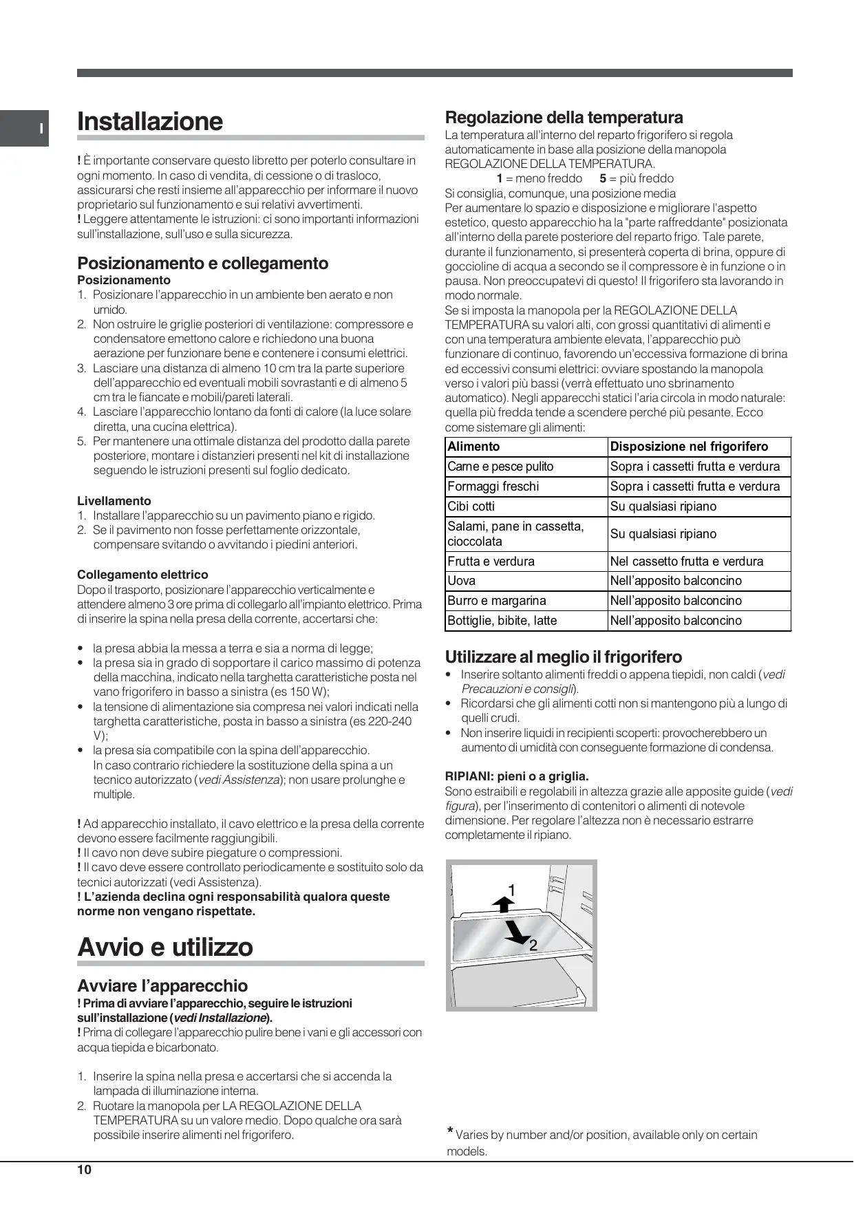 - Non inserire liquidi in recipienti scoperti: provocherebbero un aumento di umidità con conseguente formazione di condensa. RIPIANI: pieni o a griglia. Sono estraibili e regolabili in altezza grazie alle apposite guide (vedi figura), per l’inserimento di contenitori o alimenti di notevole dimensione. Per regolare l’altezza non è necessario estrarre completamente il ripiano. Avvio e utilizzo Avviare l’apparecchio ! Prima di avviare l’apparecchio, seguire le istruzioni sull’installazione (vedi Installazione). ! Prima di collegare l’apparecchio pulire bene i vani e gli accessori con acqua tiepida e bicarbonato.