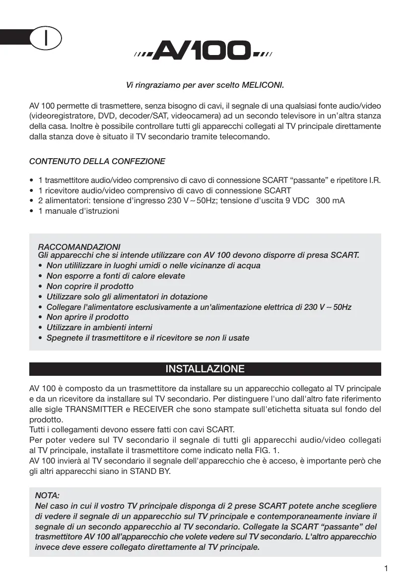 Vi ringraziamo per aver scelto MELICONI. AV 100 permette di trasmettere, senza bisogno di cavi, il segnale di una qualsiasi fonte audio/video (videoregistratore, DVD, decoder/SAT, videocamera) ad un secondo televisore in un’altra stanza della casa. Inoltre è possibile controllare tutti gli apparecchi collegati al TV principale direttamente dalla stanza dove è situato il TV secondario tramite telecomando.