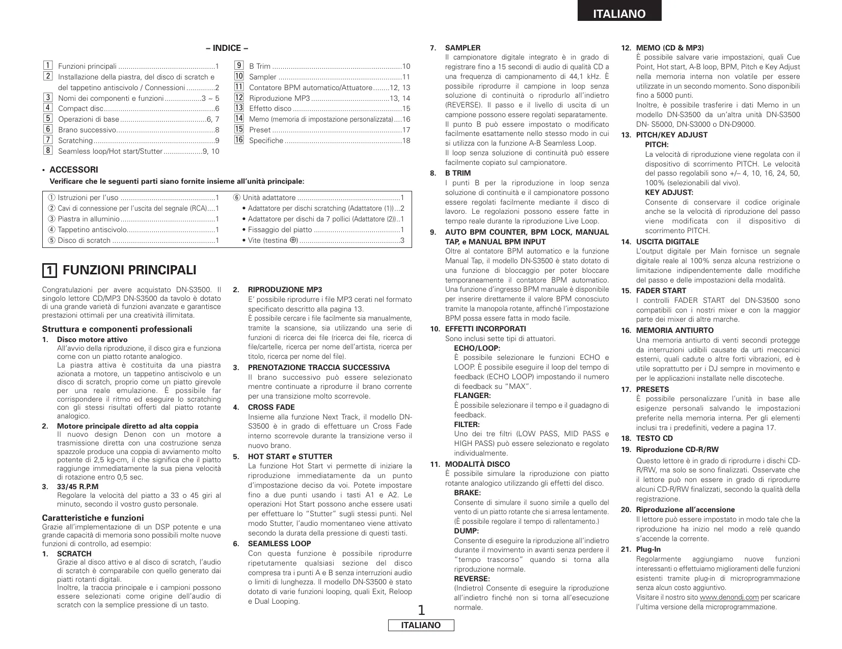 89/336/EEC et 93/68/EEC. • DICHIARAZIONE DI CONFORMITÀ Dichiariamo con piena responsabilità che questo prodotto, al quale la nostra dichiarazione si riferisce, è conforme alle seguenti normative: I materiali di imballaggio di questo prodotto sono riutilizzabili e riciclabili. Smaltire i materiali conformemente alla normative locale sul riciclaggio. Per smaltire l’unità, osservare la normativa in vigore nel luogo di utilizzo. Non gettare le batterie, né incenerirle, ma smaltirle conformemente alla normativa locale sui rifiuti chimici. • Maneje el cordón de energía con cuidado. Sostenga el enchufe cuando desconecte el cordón de energía. • Hanteer het netsnoer voorzichtig. Houd het snoer bij de stekker vast wanneer deze moet worden aan- of losgekoppeld. • Cet appareil permet l’affichage de textes composés avec les types de caractère suivants. Tous les autres types de caractère seront affichés ainsi “ ”. • Alphabétiques ABCDEFGHIJKLMNOPQRSTUVWXYZ abcdefghijklmnopqrstuvwxyz 7. SAMPLER Le Sampler numérique On-board peut enregistrer jusqu’à 15 secondes de son de qualité CD à une fréquence d’échantillonage de 44,1kHz. Il est possible d’enchaîner en continu ce sample ou de le lire à l’envers (REVERSE). Le pitch et le niveau de sortie d’un sample peuvent être réglés séparément. Le point B peut être réglé facilement ou modifié exactement de la même façon qu’avec la fonction A-B Seamless Loop. La boucle continue peut être copiée facilement dans l’échantillonneur. 8. B TRIM Les points B pour les fonctions Seamless Loop et Sampler peuvent être réglés facilement à l’aide du Scratch Disc. Les ajustements peuvent être effectués en temps réel pendant la lecture d’enchaînement en direct. 9. AUTO BPM COUNTER, BPM LOCK, MANUAL TAP, et MANUAL BPM INPUT En plus du compteur de tempo (BPM) automatique et de la fonction Tap manuelle, le DN-S3500 est également équipé d’une fonction de verrouillage pour verrouiller momentanément le compteur de tempo (BPM) automatique. Une fonction d’entrée manuelle du tempo (BPM) est également disponible pour entrer directement la valeur du tempo à l’aide d’un molette rotatif, le réglage du tempo peut ainsi être effectué facilement. 10. EFFETS A BORD Sept types d’effecteurs sont inclus. ECHO/LOOP: Les fonctions ECHO et LOOP peuvent être sélectionnées. L’enchaînement du temps de rétro-action (ECHO LOOP) est possible en réglant le numéro de rétro-action sur “MAX”. FLANGER: Le temps et le gain de rétro-action peuvent être sélectionnés. FILTER: Un des trois filtres (LOW PASS, MID PASS et HIGH PASS) peut être sélectionné et ajusté individuellement. 11. PLATTER MODE La lecture de type platine tourne-disque analogique peut être simulée à l’aide de quatre effets Platter. BRAKE: Simule un son de gondolement d’une platine tourne-disque vinyle s’arrêtant lentement. (Le délai de ralentissement peut être ajusté.) DUMP: Lit le son dans la direction inverse tout en continuant le mouvement en avant sans perdre un “temps écoulé” lors du retour à la lecture normale.