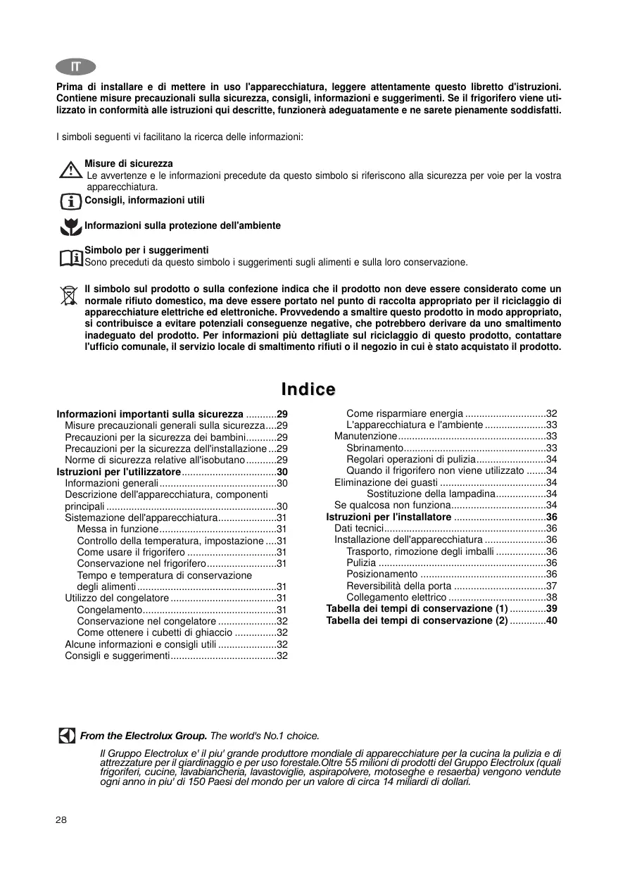 - Tabella dei tempi di conservazione (2) From the Electrolux Group. The world's No.1 choice. Il Gruppo Electrolux e' il piu' grande produttore mondiale di apparecchiature per la cucina la pulizia e di attrezzature per il giardinaggio e per uso forestale.Oltre 55 milioni di prodotti del Gruppo Electrolux (quali frigoriferi, cucine, lavabiancheria, lavastoviglie, aspirapolvere, motoseghe e resaerba) vengono vendute ogni anno in piu' di 150 Paesi del mondo per un valore di circa 14 miliardi di dollari. p. 40
